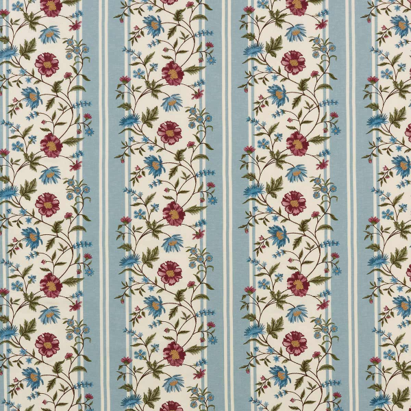 Colmar ist ein Stoff mit floralem Streifenmuster von Nina Campbell. Das Design besteht aus flexiblen Stielen, die mit blühenden Blüten und kleinen gezackten Blättern beladen sind. Jeder vertikale Streifen umrahmt die kletternden Blumensträuße, die durch einheitliche Abstände getrennt sind, die das Ganze strukturieren. Die pflanzlichen Kurven vermitteln ein Gefühl der kontinuierlichen Bewegung in einem klassischen Dekorationsstil mit ländlichen Akzenten.