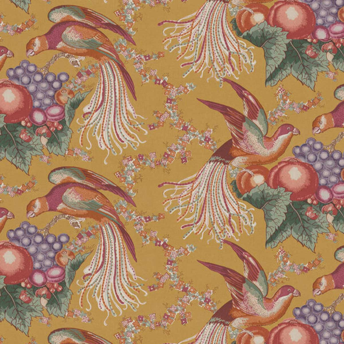 Belvedere enthüllt ein prächtiges figuratives Motiv. Vögel mit kunstvoll gearbeitetem Gefieder umgeben ein Füllhorn, das aus großzügigen Trauben, runden Früchten und üppigem Laub besteht. Leichte Blumengirlanden unterstreichen den Hintergrund und verleihen der zentralen Dichte einen zarten Kontrast. Diese Tapete von Zimmer + Rohde erinnert an eine üppige, sorgfältig inszenierte Szene.