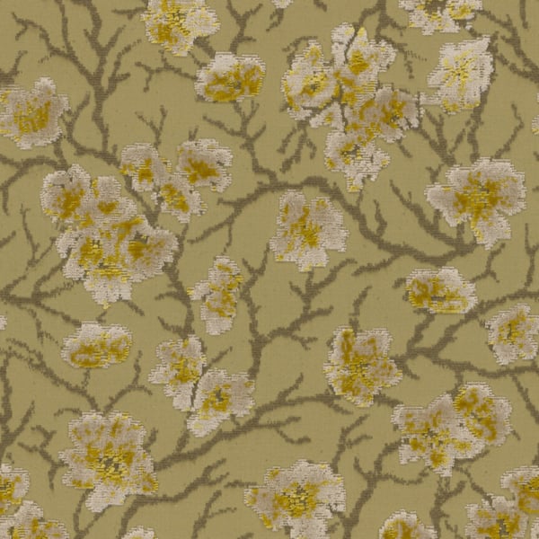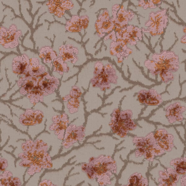 Auf dem Stoff Cherry Blossom erstreckt sich zart ein Netzwerk aus nackten Zweigen. Das florale Motiv nimmt in einem Reliefsamt Gestalt an, in dem stilisierte Blütenblätter aus dünnen Zweigen zu sprießen scheinen. Diese Komposition, signiert von Zimmer + Rohde, wechselt matte Bereiche mit leuchtenden Akzenten ab. Ein Design, das eine bewegliche und auffällige visuelle Textur hervorbringt.
