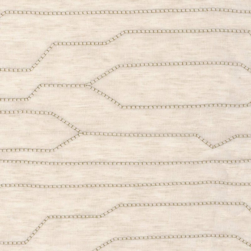 Der Stoff Cortège entfaltet ein geometrisches Muster, das auf einer Basis aus Leinen und Baumwolle sowohl präzise als auch unregelmäßig ist. Es erinnert an bewegliche, fast kartografische Linien, die sich subtil miteinander verflechten. Das Design, das durch einen aufgebrachten Seileffekt hervorgehoben wird, suggeriert eine stille Bewegung in drei Dimensionen. Die Stickerei offenbart das feine Know-how von Casamance.