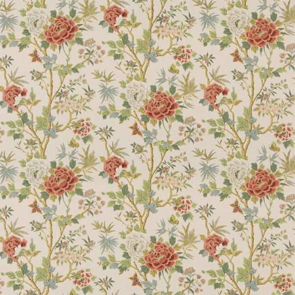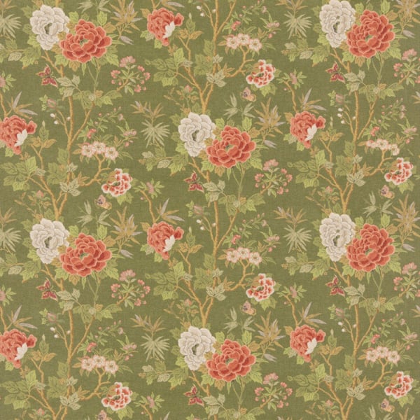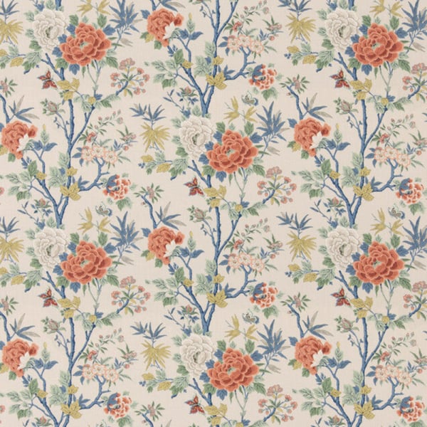 Der Stoff Canton präsentiert ein üppiges Blumenmuster, inspiriert von der asiatischen dekorativen Kunst. Gewundene Stiele erheben sich geschmeidig und tragen Pfingstrosen mit klaren Konturen, umgeben von zartem Laub. Jedes Detail des Designs bildet eine dichte Struktur mit ausgewogener Balance. Dieses von GP & J Baker signierte Textil erinnert an alte Gärten und botanische Poesie.