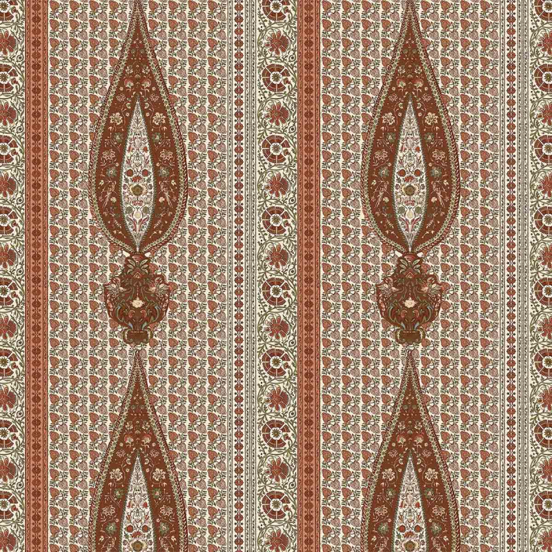 Der Stoff Indira offenbart ein ethnisches Muster, das von ineinander verschlungenen Tropfen und Friesen durchzogen ist und von klassischen orientalischen Designs inspiriert wurde. Dieses von Gastón y Daniela signierte Textil hat eine starke und strukturierte visuelle Präsenz. Die vertikalen Linien unterstreichen den Bewegungseffekt und die Tiefe in der Komposition. Jedes Detail zeugt von einem präzisen Sinn für Ornamentik.