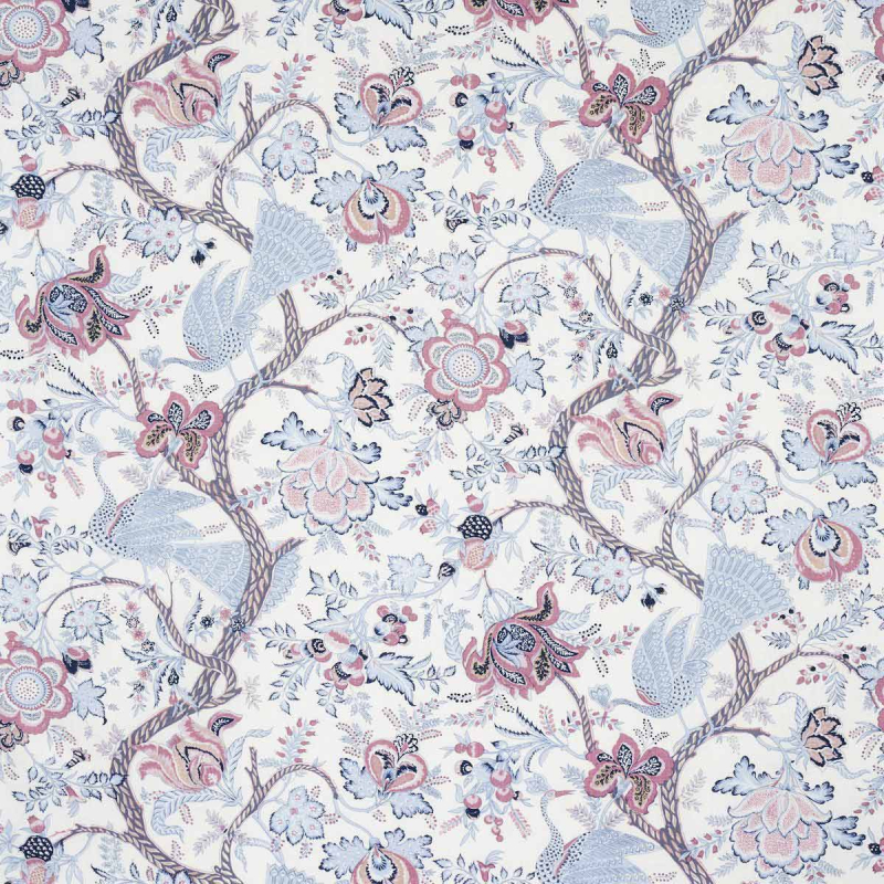 Schumacher präsentiert mit Aveline Linen einen außergewöhnlichen Stoff, auf dem ein fantasievolles Motiv mit lila Akzenten erblüht. Pfauen mit majestätischem Gang gleiten zwischen den Ranken eines blühenden Weinstocks hindurch, der eine lebendige Landschaft zeichnet. Vollständig aus Leinen gefertigt, ist es eine Hommage an die indischen Stoffe des 19. Jahrhunderts. Die anmutige Komposition und die historische Inspiration verleihen ihm eine einzigartige Präsenz.
