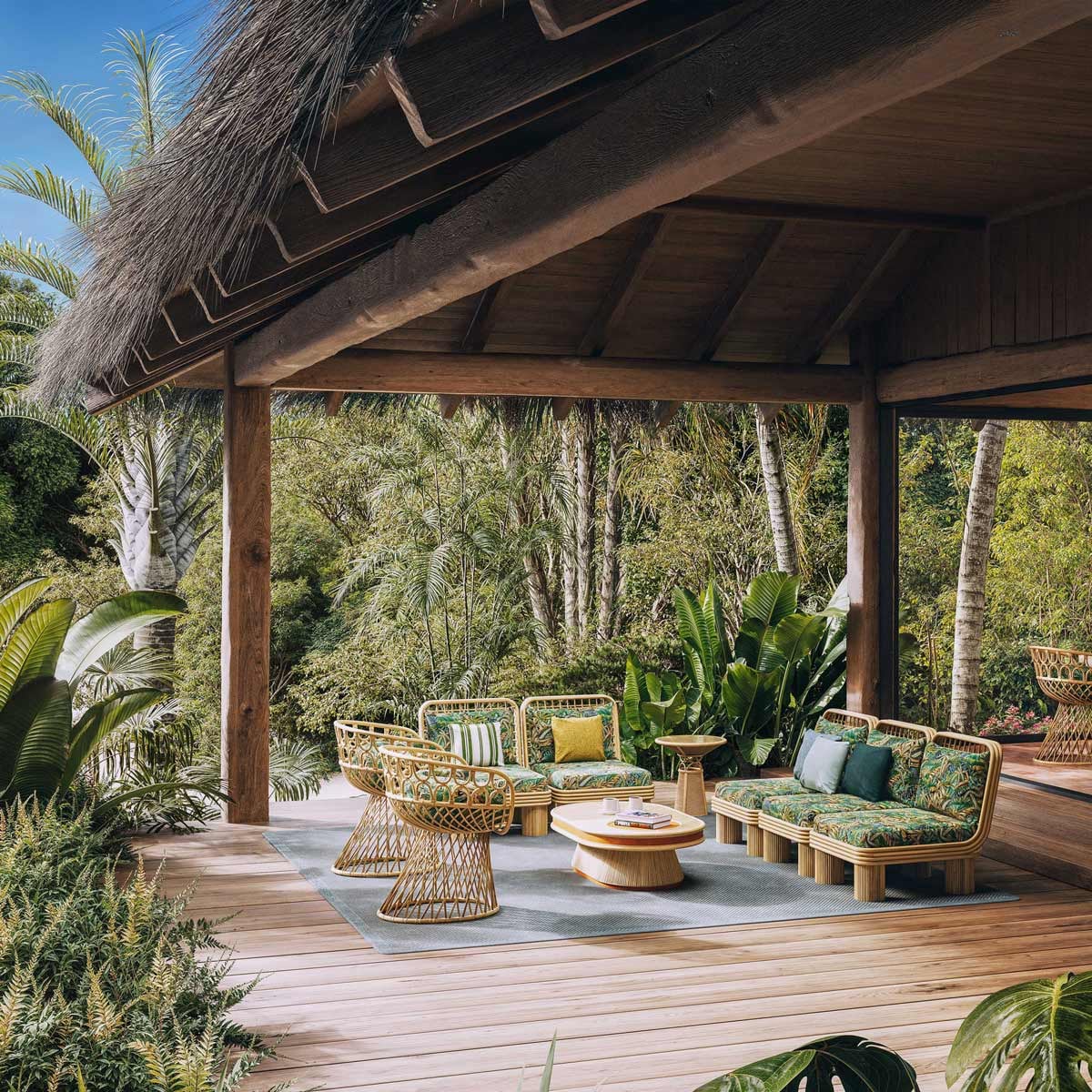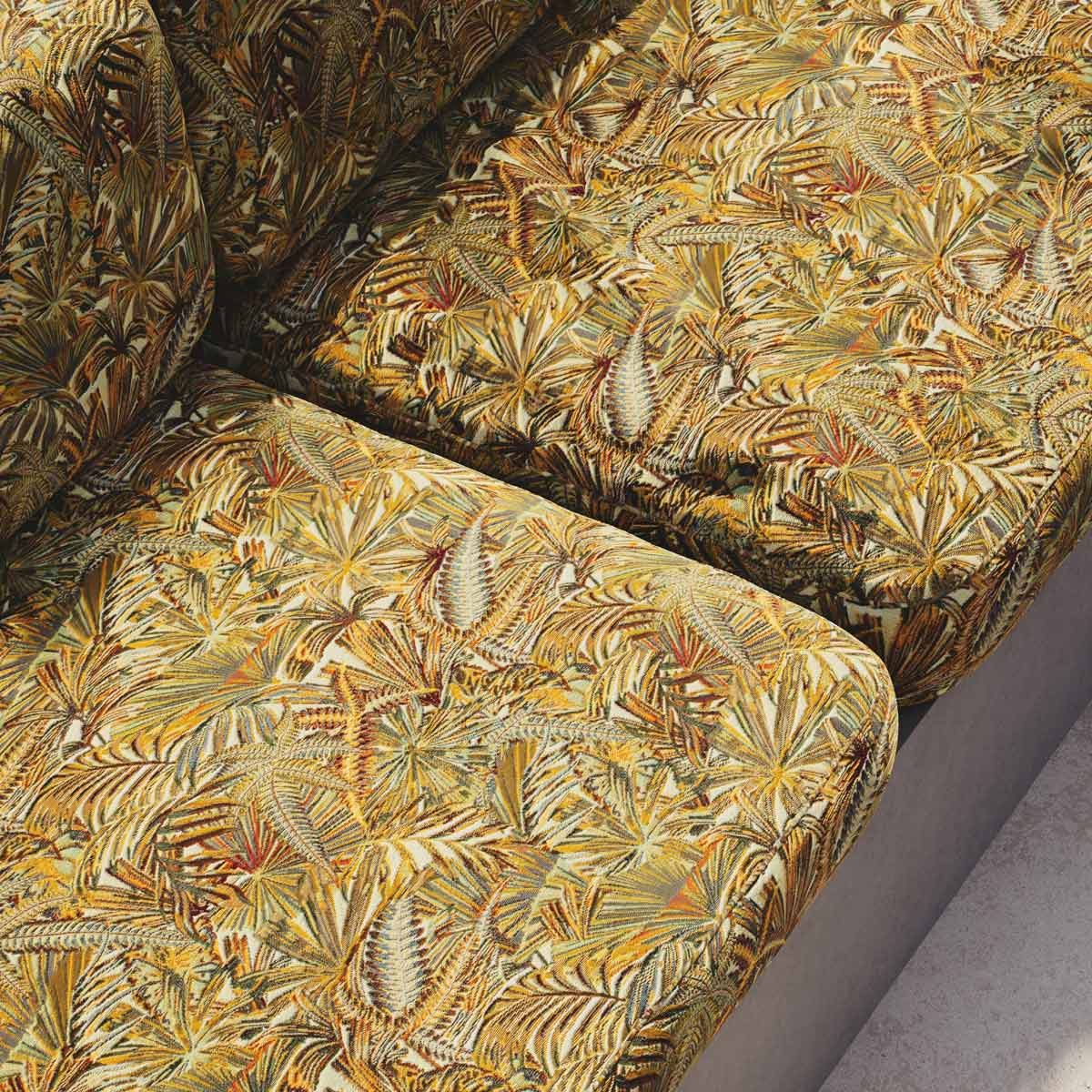 Lelièvre enthüllt Caraïbes, einen Stoff mit üppigen Akzenten, in dem sich stilisierte Palmen in einer lebendigen Fülle verflechten. Die Komposition erinnert an einen neu erfundenen Dschungel, dicht und rhythmisch, an der Grenze des Imaginären. Jede Linie zeichnet eine taktile Hommage an die tropische Vegetation, deren Opulenz sich durch eine sorgfältig gewebte Textur offenbart. Die Natur wird hier zu einem lebendigen Atemzug.