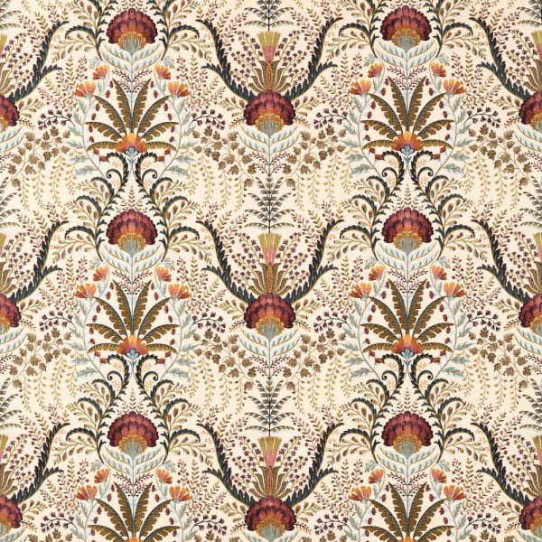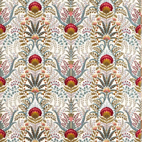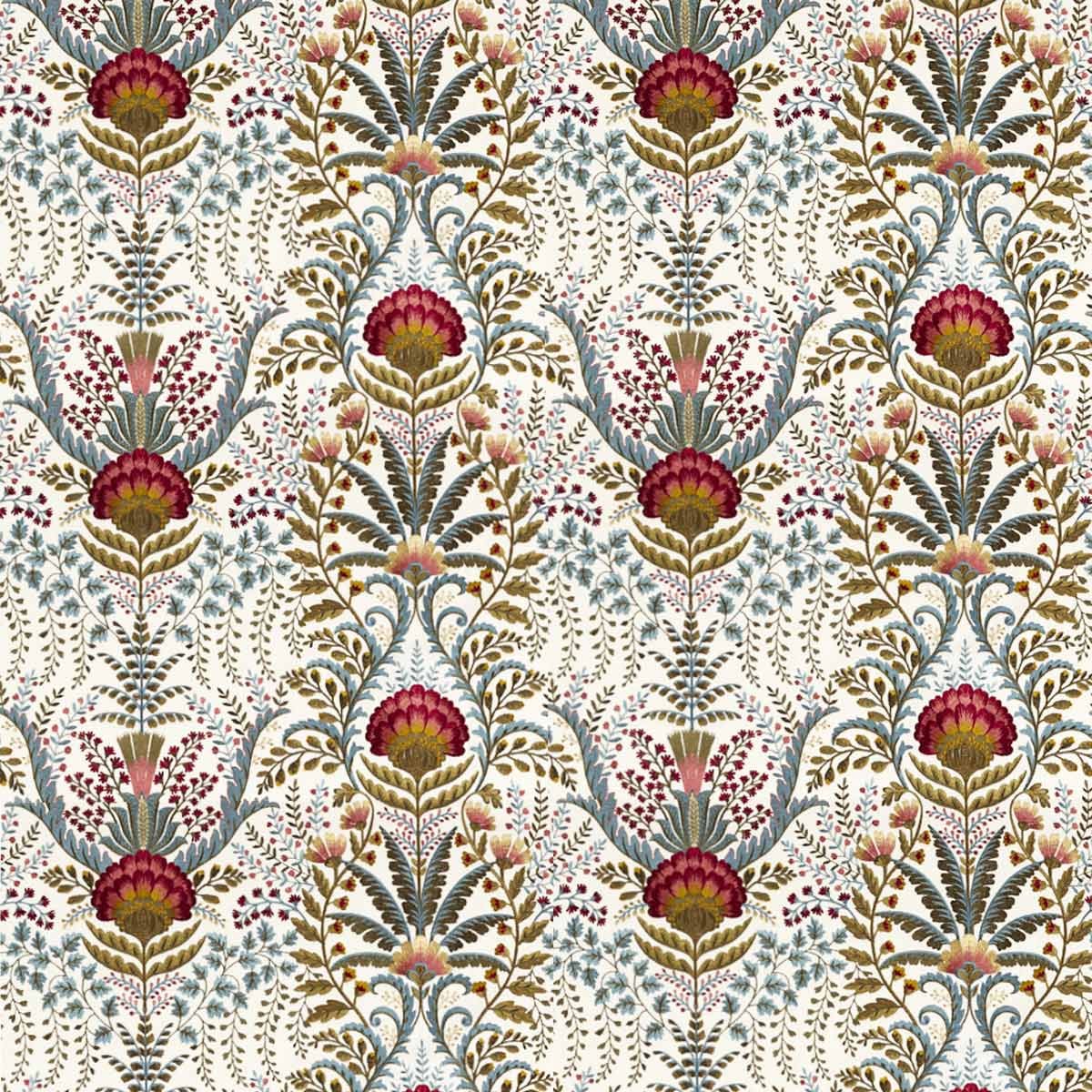 Bei Sanderson zelebriert der Stoff Marrienne die Opulenz eines stilisierten Gartens. Das vollständig bestickte Pflanzenmotiv entfaltet sich in rhythmischen Arabesken, in denen sich Nelken und Mohnblumen mit fächerförmig angeordneten Blättern vermischen. Das wie Damast strukturierte Gesamtbild bildet eine raffinierte Landschaft von großer taktiler Fülle. Baumwolle, der Hauptstoff, verleiht der Komposition eine natürliche Weichheit.