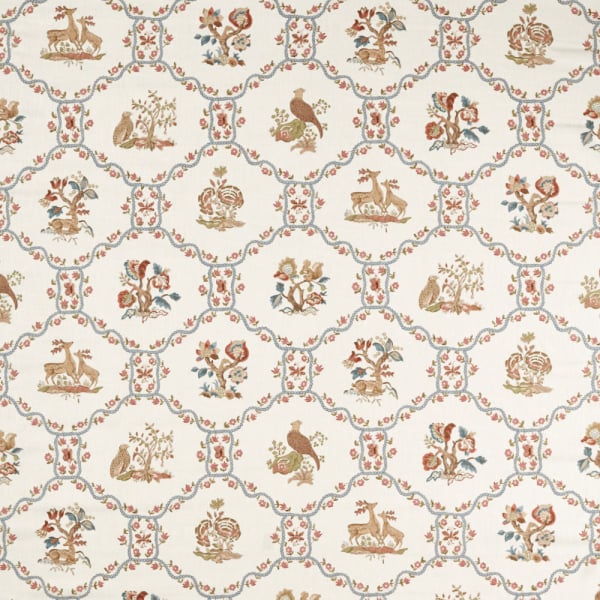 Mit Partridge Pear komponiert Sanderson eine detailreiche Szene, die sowohl dicht als auch geordnet ist. Dieser Stoff hebt ein achteckiges Gitter hervor, das von Hirschen, Vögeln, Eichhörnchen und stilisierten Bäumen bevölkert ist. Das von den jakobinischen Traditionen inspirierte Muster präsentiert sich in Form eines Freskos mit Pflanzen und Tieren in strengem grafischem Design. Jedes bestickte Medaillon scheint ein in der Zeit eingefrorenes Fragment der Natur einzufangen.
