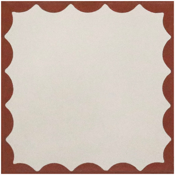 Die Zementfliese Scallop offenbart ein geometrisches, gewelltes Muster mit einer sorgfältig gezeichneten Linie. Jede Kante ist mit regelmäßigen Halbkreisen unterstrichen und zeichnet ein grafisches Gitter mit dekorativen Akzenten. Dieses von Marrakech Design handgefertigte Stück setzt einen zarten und strengen visuellen Rhythmus. Es ist Teil eines Gleichgewichts zwischen dezenter Verzierung und grafischer Struktur.