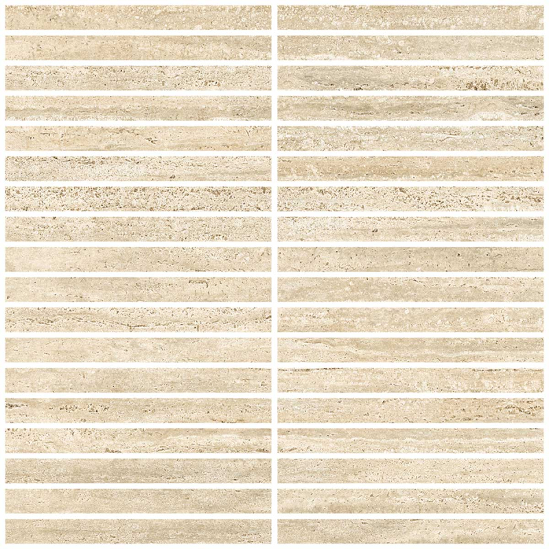 Mit seinen sorgfältig angeordneten geradlinigen Fragmenten überträgt Mosaïque Bacchette das strukturierte Erscheinungsbild eines Schnittsteinlayouts. Diese Feinsteinzeugfliese erinnert an eine Oberfläche, die durch feine Schichten in einem geometrischen Muster strukturiert ist. Der visuelle Effekt, sowohl grafisch als auch mineralisch, spielt mit Unregelmäßigkeiten, um eine organische Ästhetik zu komponieren. Diese Kreation von Fioranese schöpft aus der Sprache des Materials.