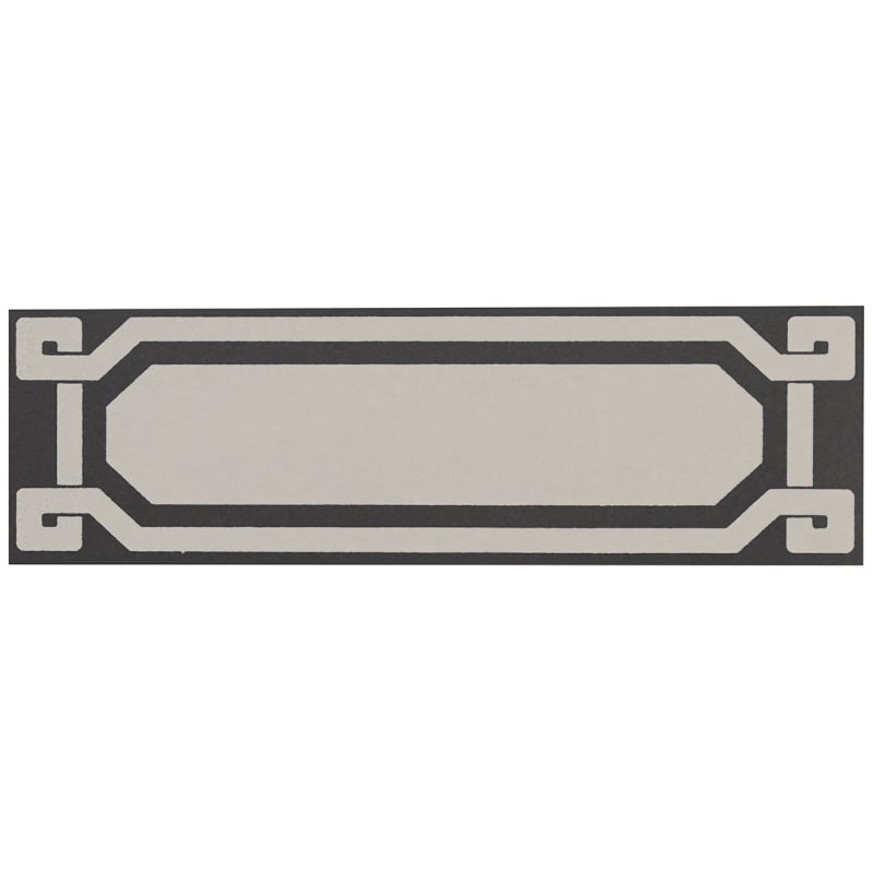 Der von Ceramiche Grazia hergestellte Feinsteinzeug Listello Decoro Black zeichnet sich durch eine präzise Zierrahmung aus. Sein geometrisches Muster offenbart eine symmetrische Struktur, die aus einem zentralen Rechteck besteht, das von klaren Linien begrenzt wird. Abgerundete Details an den Ecken unterstreichen das Ganze. Dieses Dekor aus Feinsteinzeug vereint mineralische Dichte und feine Ausführung.
