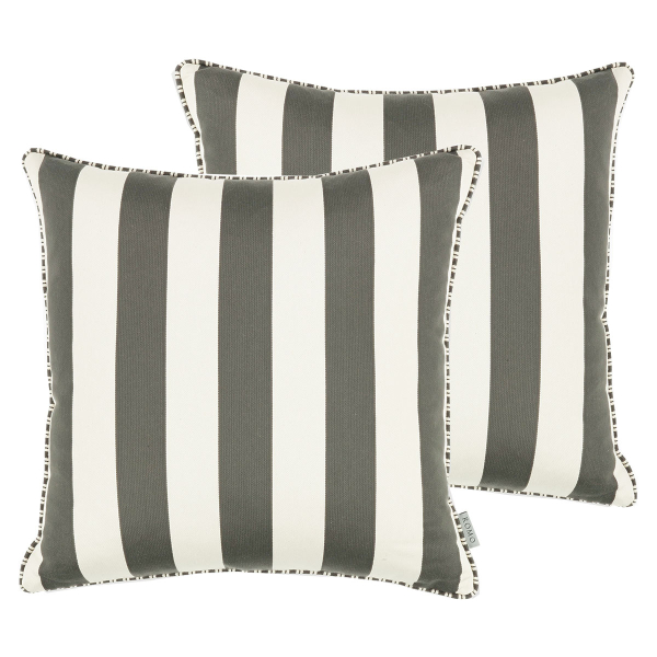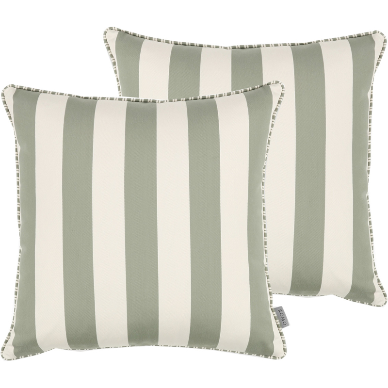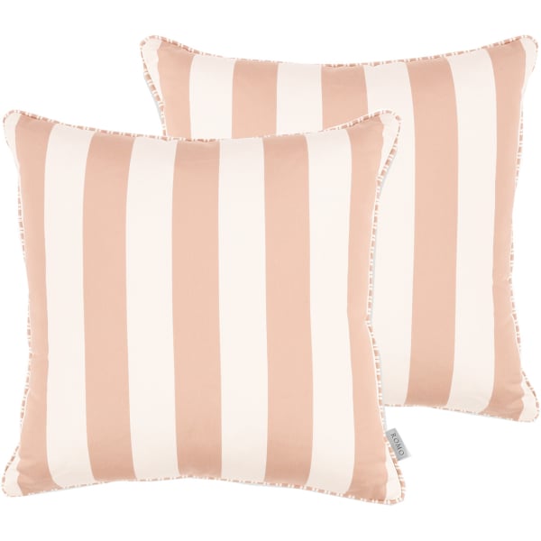 Aron ist ein quadratisches Kissen, das durch ein breites vertikales Streifenmuster belebt wird. Sein Baumwollstoff offenbart eine natürliche, matte Textur mit einem weichen Griff. Eine zart gestreifte Paspel mit feineren geometrischen Formen schafft einen subtilen Dialog mit den Hauptstreifen. Romo komponiert hier eine klassische Grafik, die durch Rhythmus strukturiert und durch Details gemildert wird.