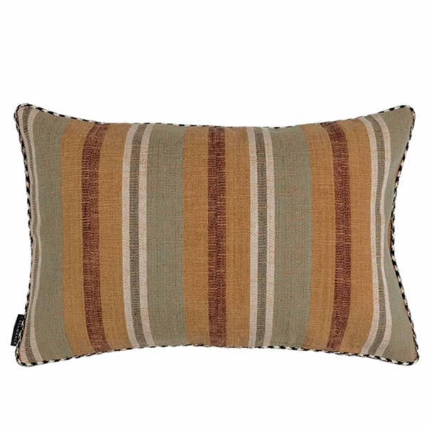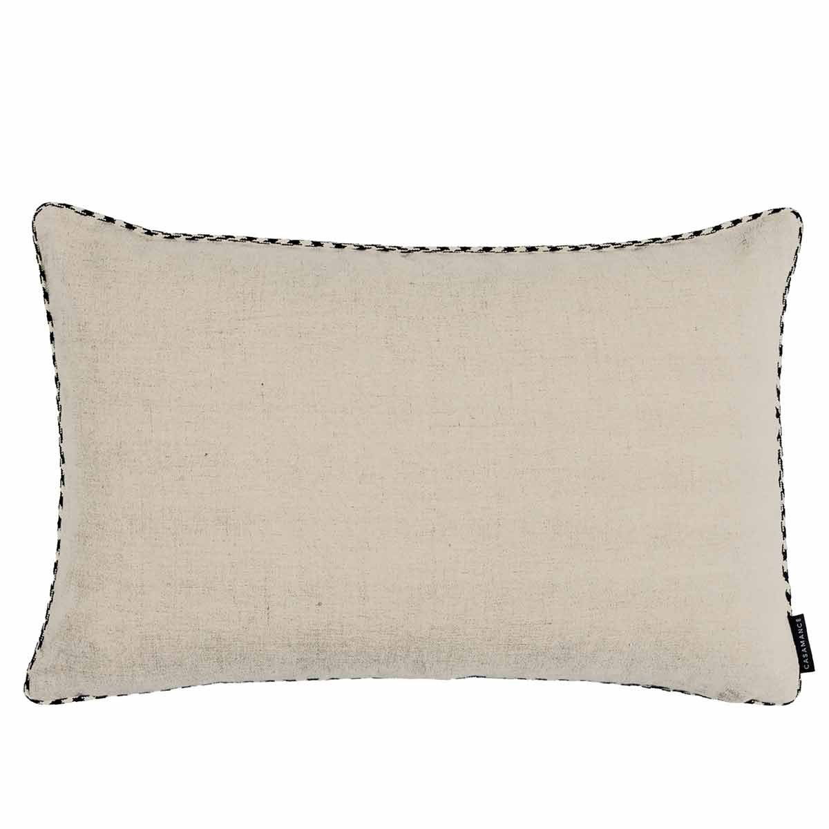 Das rechteckige Kissen Via Verri spielt mit der Dualität der Texturen. Das Streifenmuster auf der Vorderseite wird durch vertikale Streifen mit unregelmäßigem Rhythmus belebt, die den visuellen Reichtum der Naturfasern offenbaren. Die einfarbige Rückseite ruht auf einem rauen und raffinierten Stoff, der das Ganze ausbalanciert. Eine kontrastierende geflochtene Paspel unterstreicht präzise die Konturen und unterstreicht den Charakter dieses von Casamance geschaffenen Dekors.