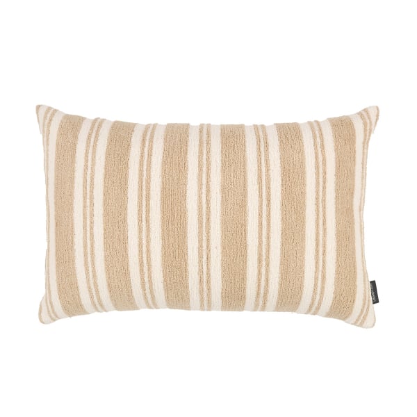 Knight ist ein rechteckiges Kissen, das mit einem unregelmäßigen Streifenmuster verziert ist, das die Oberfläche rhythmisiert. Der Wechsel von dicken und dünnen Streifen erzeugt eine kontinuierliche, subtile und strukturierte visuelle Dynamik. Der Stoff besteht aus einer weichen Mischung aus recycelter Chenille-Baumwolle und fühlt sich weich an. Kirkby Design bevorzugt einen rohen grafischen Ausdruck, der in eine präzise organische Kadenz eingeschrieben ist.