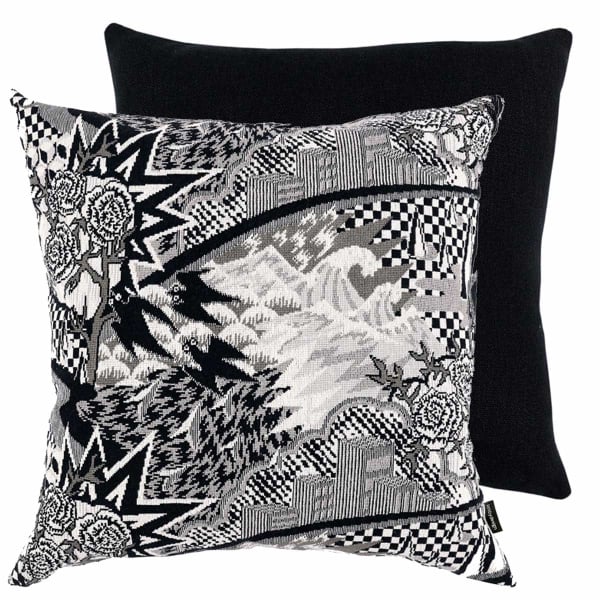 Auf dem Kissen Graphic Fairytale skizziert ein erzählerisches grafisches Motiv traumhafte Landschaften und stilisierte urbane Strukturen. Auf der Vorderseite entfalten sich zersplitterte Linien, zerbrochene Berge und schematische Blumen. Die einfarbige Rückseite aus mit Steinen gewaschenem Leinen steht im Kontrast zum Reichtum des Designs. Dieses Dekor offenbart das Know-how von Kirkby Design in Zusammenarbeit mit Eley Kishimoto.