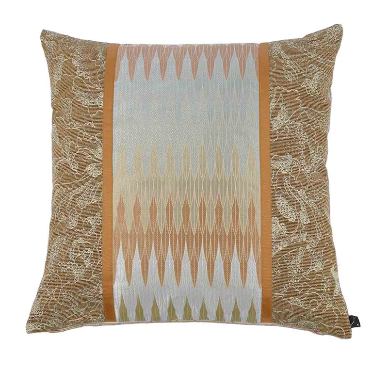 Das Kissen Misono kombiniert ein gewagtes geometrisches Muster mit einem opulenten floralen Hintergrund. Ein breites zentrales Band, strukturiert wie ein Fries aus verschachtelten Spitzen, gibt der Komposition ihren Rhythmus. Der Kontrast zwischen grafischer Strenge und üppiger Ornamentik offenbart die Sensibilität des Designs. Dieses Modell von K3 Design by Kenzo Takada erinnert an die stilisierte Bewegung eines traditionellen Webens.