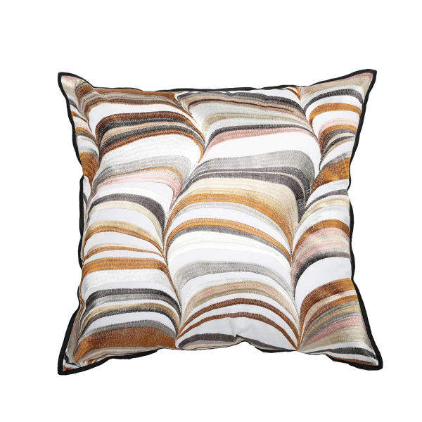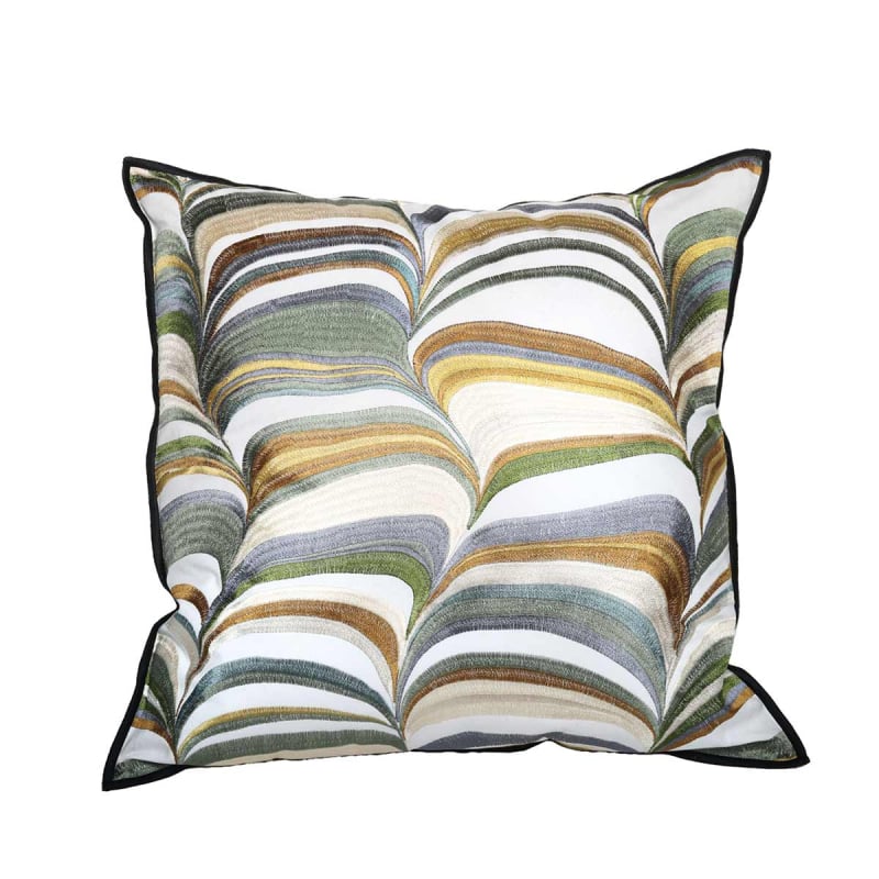 La Maison Casamance signiert das Kissen Strates, dessen geometrisches Muster an auf Baumwolle gestickte Mineralschichten erinnert. Die Oberfläche wird von wellenförmigen Linien durchzogen, die das Material formen und ein dezentes Relief erzeugen. Auf der Rückseite sorgt einfarbiges Naturleinen für eine schlichte und taktile Präsenz. Eine Einfassung im Satinstich zeichnet eine klare und markante Kontur.