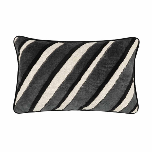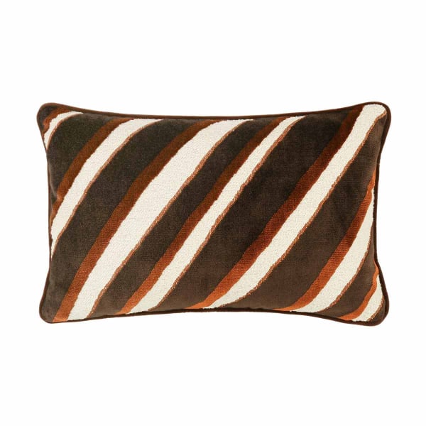 Zinc gestaltet das Kissen Melrose als Hommage an das ikonische Diplomaten-Sofa der 70er-Jahre. Seine schrägen Streifen kommen auf einem kontrastierenden Gewebe aus flauschigem Samt und weichem Bouclé zur Geltung. Die rechteckige Form, die durch eine dezente Paspelierung betont wird, sorgt für einen grafischen Look. Das lebendige, rhythmische Muster scheint durch das Material zu gleiten.