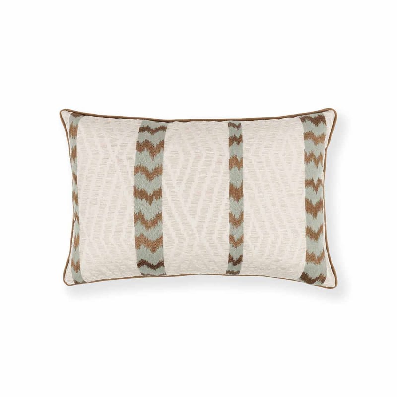 Romo präsentiert das Kissen Indu, bei dem sich die Rauten wie ein lebendiges Gewebe ausbreiten, das durch einen gestickten Streifen mit einem entschlossenen Rhythmus aufgewertet wird. Sein vom Ikat inspiriertes geometrisches Muster besteht aus subtilen Kontrasten und sich kreuzenden Reliefs. Kurze Fäden und strukturierte Stiche wechseln sich ab und lassen die Oberfläche lebendig wirken. Eine Paspel umrahmt das Ganze mit einer klaren Linie.
