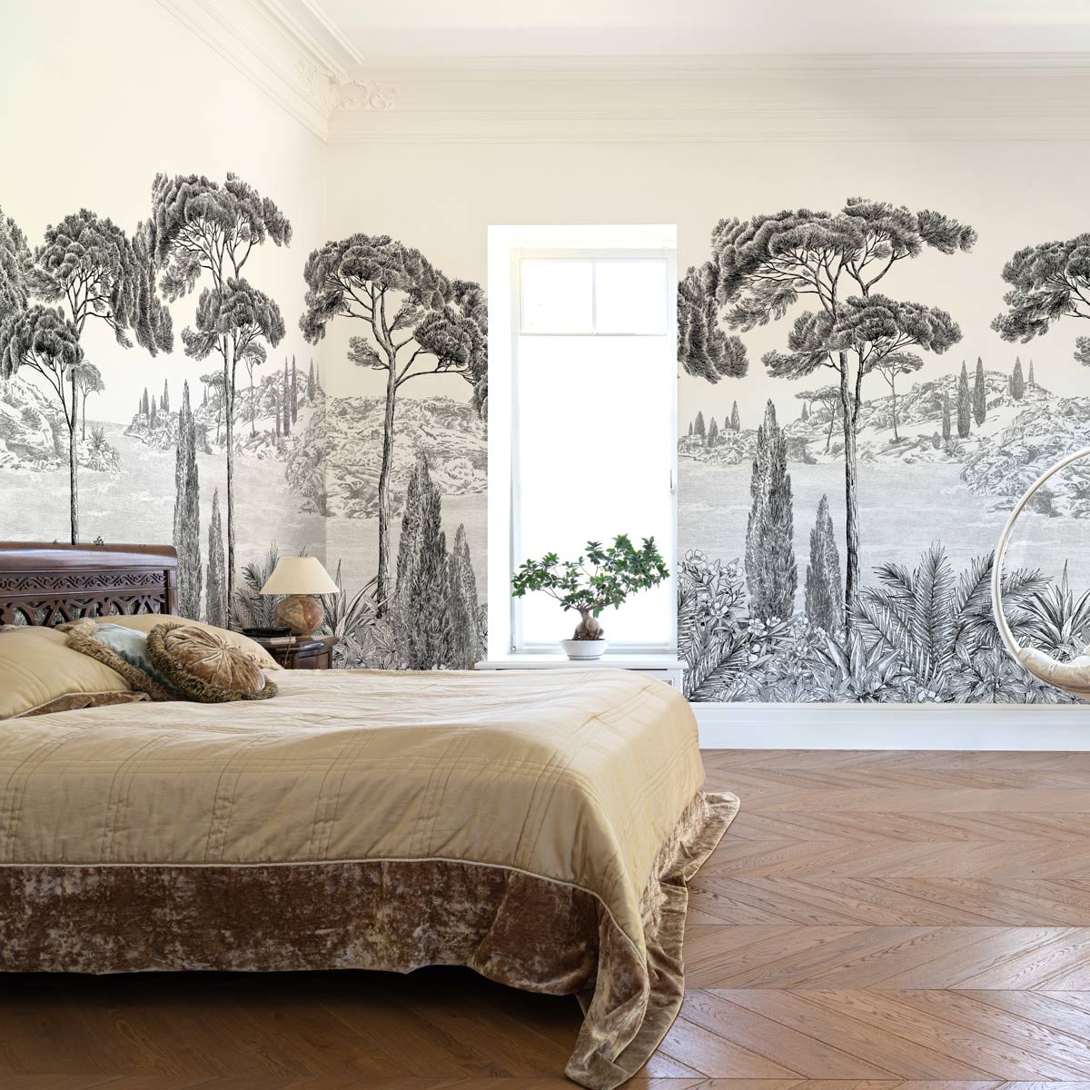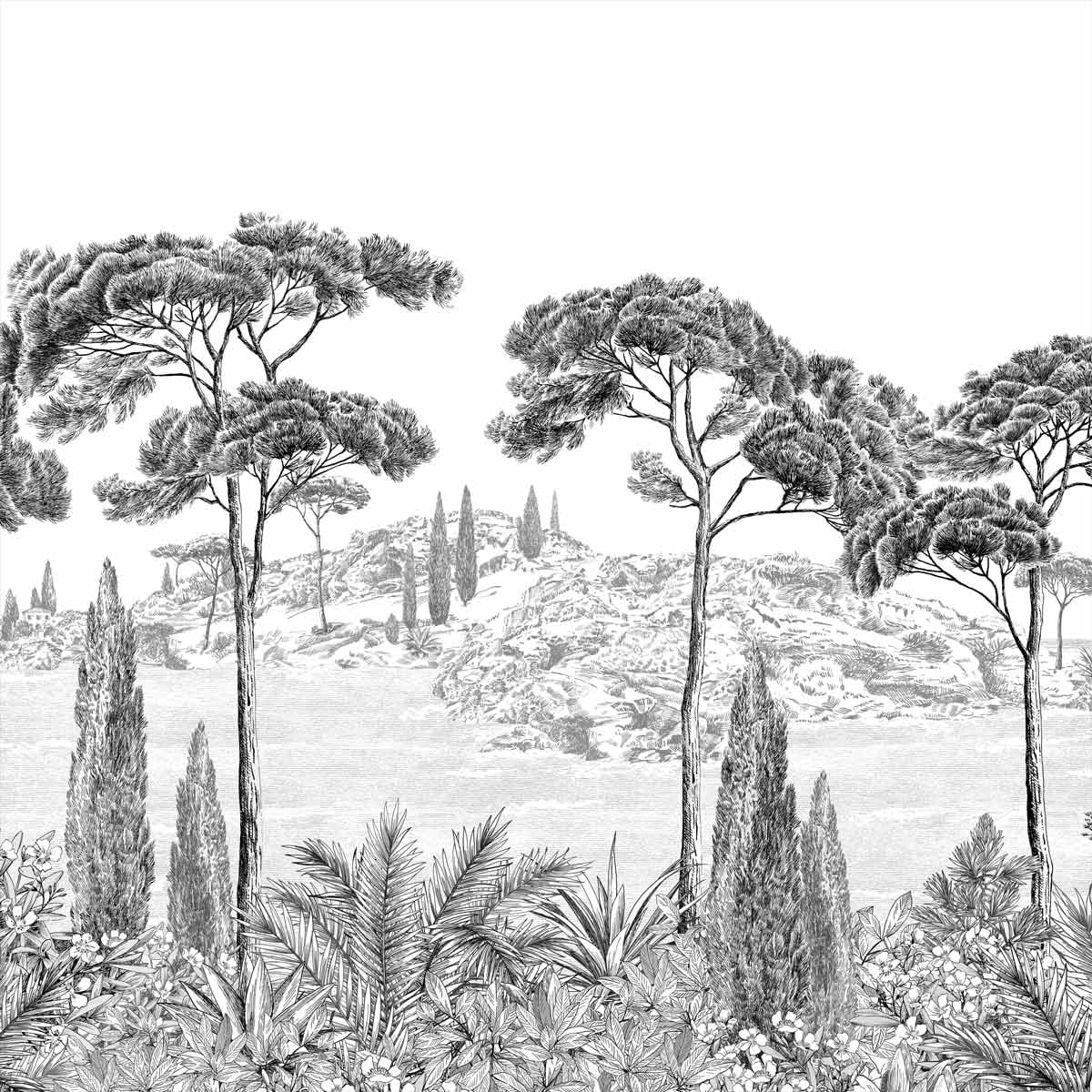 Das ursprünglich von den Künstlerinnen Martine Dubreucq und Isabelle Parmentier mit Feder gezeichnete Panoramatapetenmuster „Péninsule“ zeigt eine mediterrane Küstenlandschaft. Hohe Pinien, charakteristisch für die Region, stehen neben Oleander, Palmen und Zypressen und überblicken das Meer. Die Palette nuancierter Grau- und Schwarztöne fängt das Licht, die Farben und die Düfte ein, die typisch für diese Küstenlinie sind. Das von Isidore Leroy herausgegebene Design verleiht Räumen Tiefe und Ruhe.