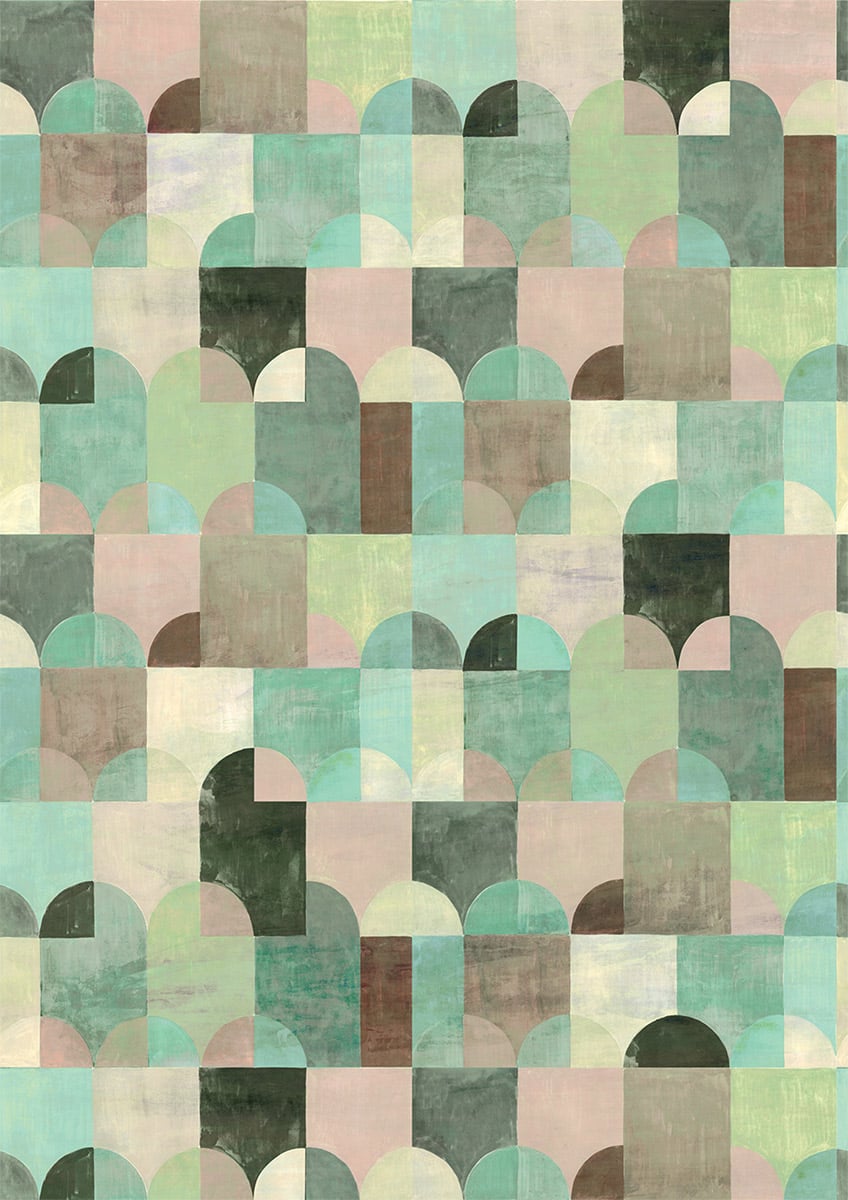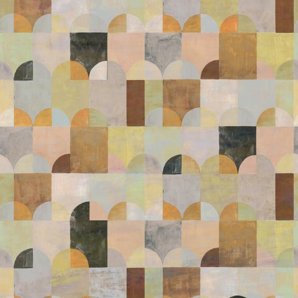 Die von Masureel angebotene Panoramatapete Arc besticht durch ihr modernes Design im Sobborgo-Stil. Ein abstraktes Gemälde zeigt ein Dorf, dessen Häuser und Bäume von geometrischen Formen dargestellt werden. Die Tapete ist in einer Auswahl an Erd- und Pastelltönen erhältlich und zeichnet sich durch eine strukturierte Oberfläche aus, die durch die Verwendung von Quellfarbe erzielt wird.