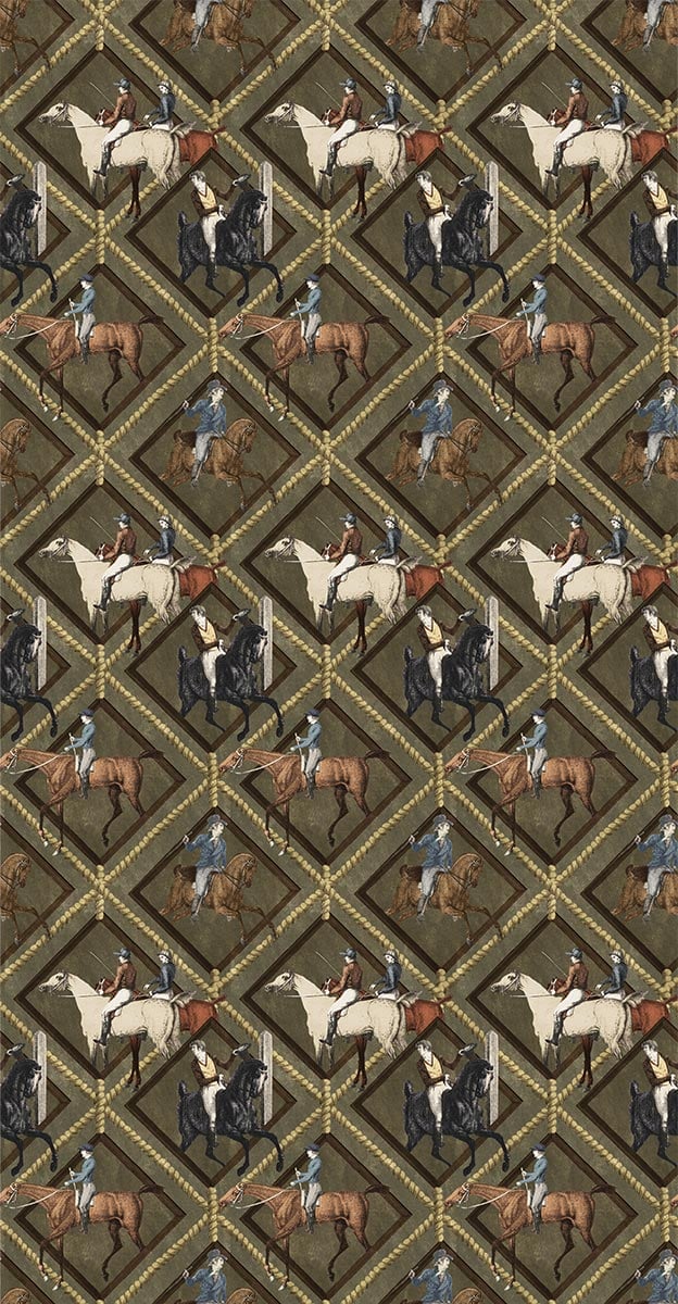Das Gymkhana-Motiv stellt Reiter in den Mittelpunkt, die den Reitsport lieben. Sie sind von rautenförmigen Rahmen und geknoteten Seilen vor einem glatten Hintergrund umgeben. Diese Panoramadekoration von Mindthegap ist eine Hommage an diesen beliebten englischen Sport.