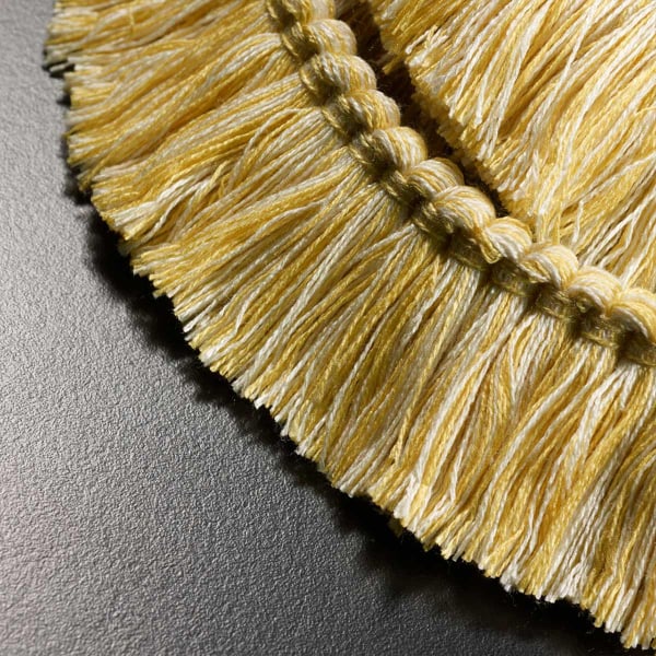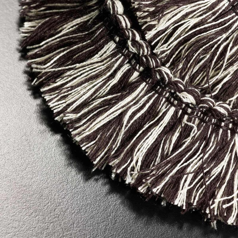 Lange zweifarbige Bordüren bilden die von Dedar herausgegebenen Fransen Pod006 Outdoor. Die geflochtenen Fäden zeichnen einen dichten und organischen Rhythmus auf dieser Posamenterie. Sie erforscht den Kontrast zwischen dicken Texturen und freien Oberflächen in einer Komposition mit handwerklichen Akzenten. Die Struktur ruht auf einem flexiblen Rahmen, der für den Außeneinsatz ausgelegt ist.
