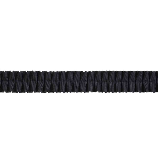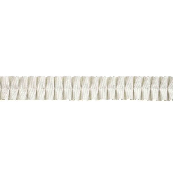 Das Falbala-Band ist eine Kreation von Houlès mit klaren Plisseefalten, die in regelmäßigen grafischen Linien angeordnet sind. Sein Band mit breiten Rillen bildet ein dezentes, fast architektonisches geometrisches Muster. Der Volumeneffekt entsteht durch eine gekonnt rhythmische Faltung, die an eine moderne Spitzenpassementerie erinnert. Das Ganze spielt mit der Textur und weist eine dichte Webart mit strukturiertem Griff auf.