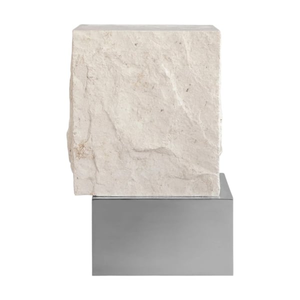Der Beistelltisch Temple Tall Chrome stellt einen Dialog zwischen der Rauheit eines rohen Mineralmusters und der Kälte eines glatten Sockels dar. Der an den Seiten von Hand behauene Kalksteinblock behält seine unregelmäßigen Reliefs. Er ruht auf einem geometrischen und reflektierenden Metallfuß. Dieses von 101 Copenhagen entworfene, hohe Stück fängt die Essenz eines skulpturalen Gleichgewichts ein.