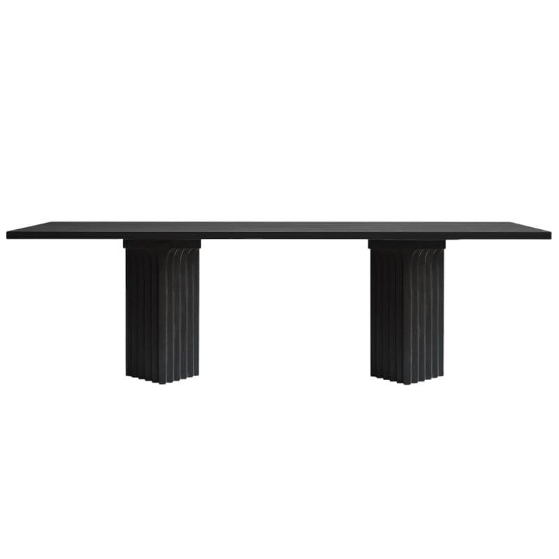 Ein Stil, der sowohl minimalistisch als auch skulptural ist, macht den Esstisch Arc aus, der von 101 Copenhagen herausgegeben wird. Die Tischplatte aus massiver Eiche zeichnet sich durch ihre Langlebigkeit, ihre natürliche Stabilität und die Reichhaltigkeit ihrer Maserung aus. Diese Struktur ruht auf geriffelten Beinen, die an die klassische Architektur erinnern. Das Stück verkörpert einen formalen Ansatz für Möbel, zwischen Balance und Ausdruck.