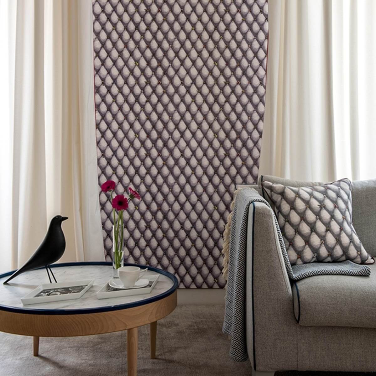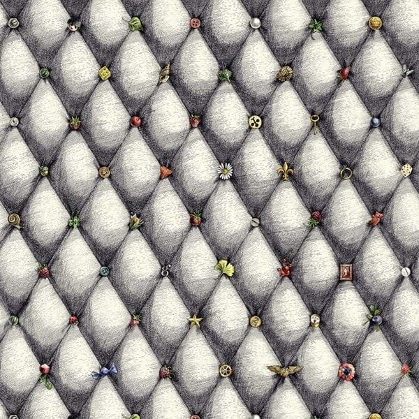 Die Designerin Catherine Gran für Edmond Petit lenkt kleine Alltagsgegenstände ab, die die Knöpfe an den Polstern ersetzen. Prächtige Grautöne vermitteln mit dem gezeichneten Erscheinungsbild einen Eindruck von Volumen. Wie ein Kuriositätenkabinett verwandelt die Tapete Vide Poche gewöhnliche Gegenstände in kostbare Miniaturschätze. Blätter, Bonbons, Nüsse, Schrauben und Perlen werden farbig auf neutralem Hintergrund dargestellt.