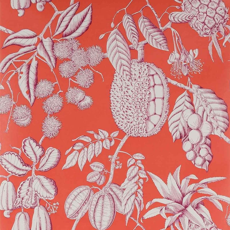 Tropische Früchte bilden das Pflanzenmuster der Tapete Balangan. Es ist mit leicht verschwommenen Linien gezeichnet und hebt eine Jackfrucht, eine Ananas und helle Sternfrüchte hervor, die mit dem einfarbigen Hintergrund kontrastieren. Dieses exotische Design von Manuel Canovas ist in leuchtenden und pastellfarbenen Tönen erhältlich.