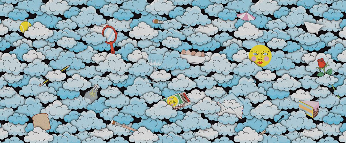 Diese mit Yo2 signierte Panorama-Wanddekoration stellt einen Himmel aus kleinen blauen Wolken dar, die einen Stern tragen, und verschiedene unpassende Gegenstände in einem kompromisslosen zeitgenössischen Stil.