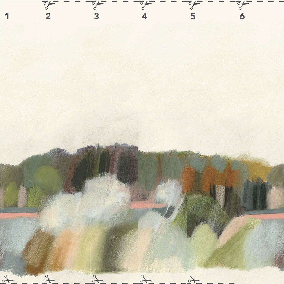 Die Panorama-Tapete Welbeck von Villa Nova skizziert eine Landschaft mit bewusst verschwommenen Konturen. Die Formen deuten auf Bäume und natürliche Elemente in einer abstrakten Komposition hin. Die in trockenem Pastell ausgeführte Zeichnung weist geschwungene und überlagerte Akzente auf. Der Gesamteindruck ist der eines Dekors zwischen Traum und Erinnerung, wie durch einen Schleier gesehen oder in einem gedämpften Licht eingefangen.