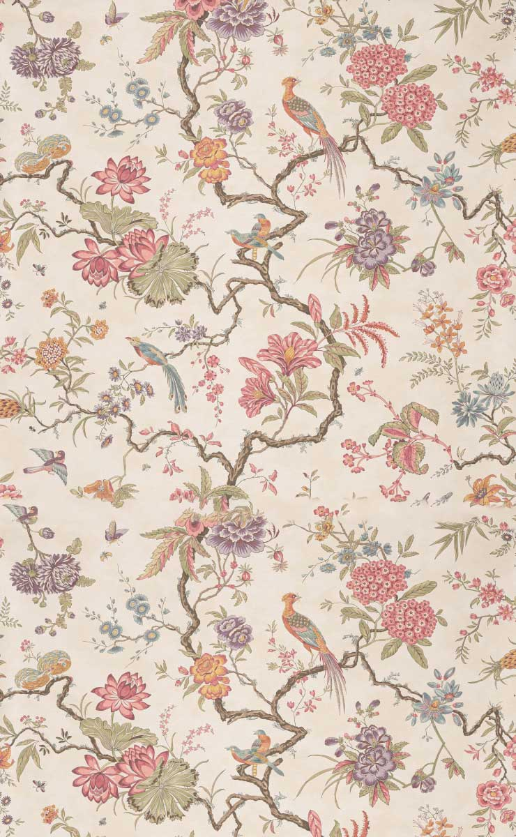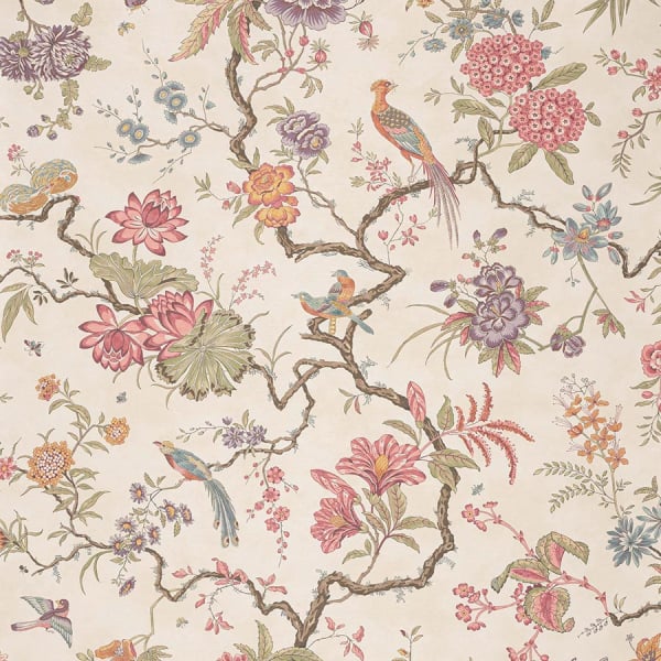 Die Wandverkleidung Pavillon de Bidaine enthüllt ein Blumenmuster, das von einem ikonischen Design inspiriert ist. Gewundene Zweige zeichnen einen Baum des Lebens mit seinen üppigen Blüten und stilisierten Blättern. Anmutige Vögel mit ästhetischem Gefieder beleben diese Pflanzenszene, die von naturalistischer Sanftheit geprägt ist. Diese Kreation von Manuel Canovas basiert auf einem Träger mit Seideneffekt.