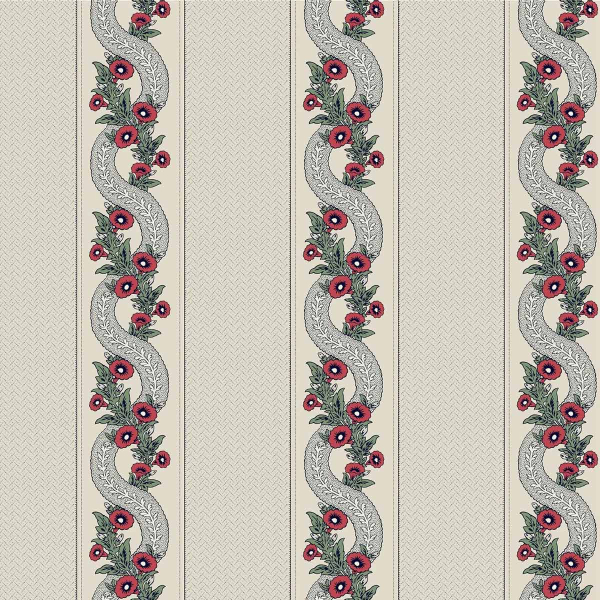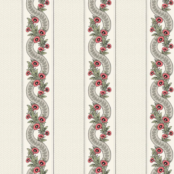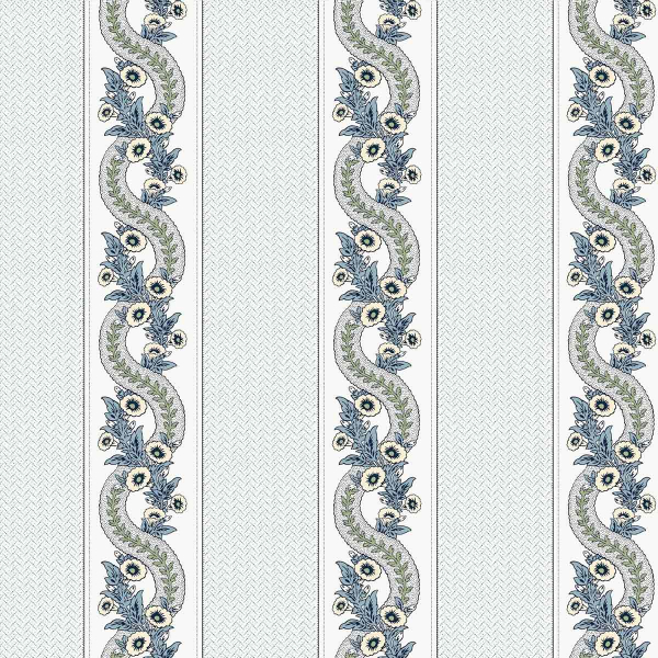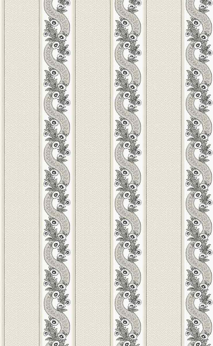 Die Tapete Abbey's Garland stellt florale und geometrische Elemente in einer Komposition von York Wallcoverings gegenüber. Ein gewundener Fries erhebt sich zwischen schlichten Bändern und bildet Arabesken, die von Weinreben und Glocken gesäumt sind. Diese dekorativen Kurven wechseln sich mit strukturierten Säulen mit fein rhythmischem Design ab. Das Ganze offenbart ein subtiles Gleichgewicht zwischen Ornamentik und grafischer Strenge.
