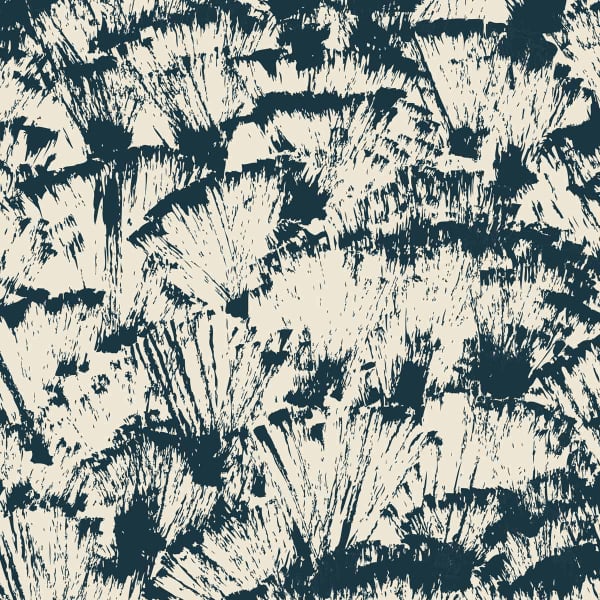 Die Tapete Pinceaux von Raccord Parfait zeigt ein abstraktes Muster, das die weiten und spontanen Gesten des Pinsels imitiert. Zersplitterte Formen, die stilisierten Palmen ähneln, sind in einem rhythmischen und grafischen Raster verteilt. Die ausgefransten Ränder, die scharfen Unterbrechungen und die Variationen der Linie spiegeln eine rohe, im Moment eingefrorene Geste wider. Der hochpräzise Druck bringt jede Nuance zur Geltung, um den Kontrast zwischen den vollen Bereichen und den weißen Reserven hervorzuheben.