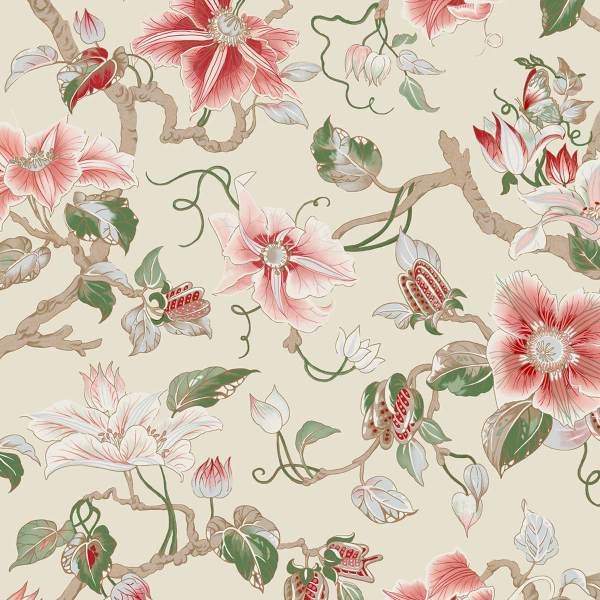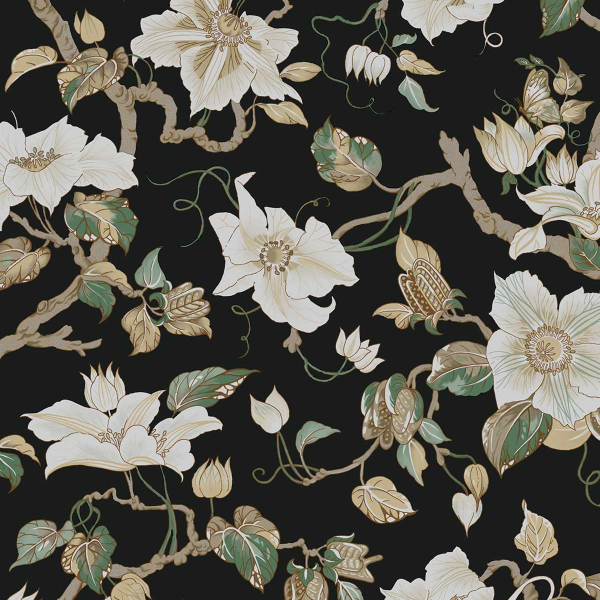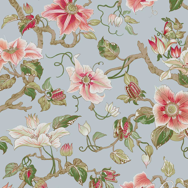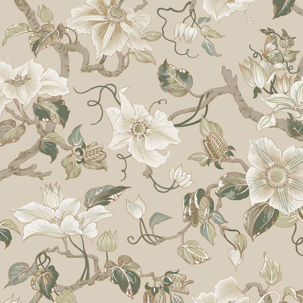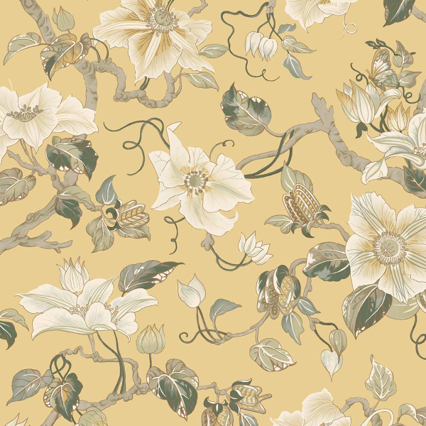 Ein stilisiertes Blumenmuster erstreckt sich über die Tapete Marguerite von York Wallcoverings. Gewundene Stängel durchziehen das Dekor und tragen große, aufgeblühte Blüten mit sorgfältig gestreiften Blütenblättern. In einer meisterhaften Komposition stimmt die grafische Arbeit mit den geschwungenen Linien des Laubs überein. York Wallcoverings enthüllt ein Design voller Pflanzenpoesie, zwischen Traum und Erinnerung.