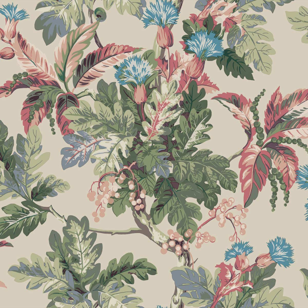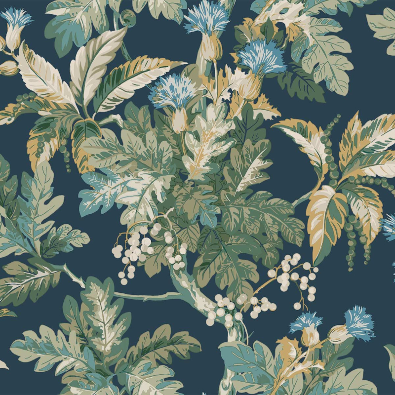 Die Tapete Briarwood entfaltet sich wie ein Pflanzenfresko, in dem sich große Blätter anmutig kreuzen und verflechten. Auf seiner Oberfläche erinnert ein botanisches Muster, das mit Beeren und aufgesprungenen Blüten angereichert ist, an die Vitalität eines wilden Gartens. Das Design unterstreicht die Zartheit der Formen und Details. Diese von York Wallcoverings signierte Tapete ist in einer zeitlosen Ästhetik verwurzelt.