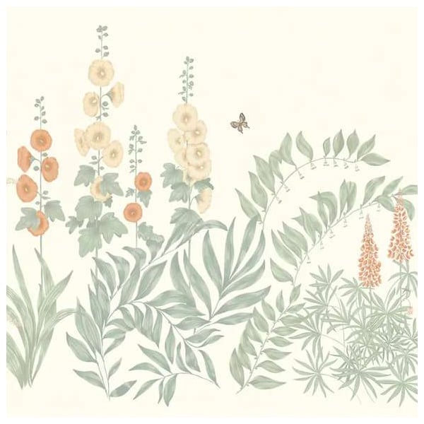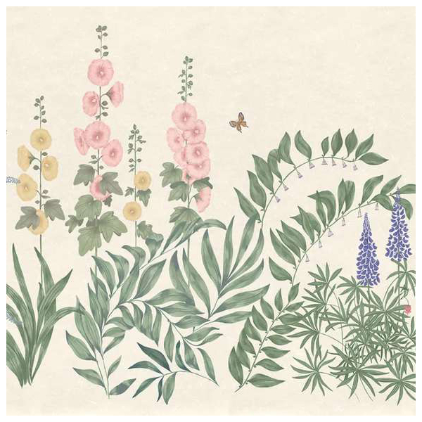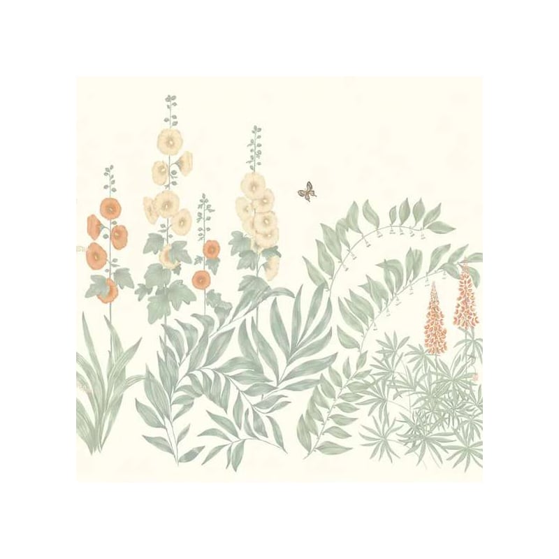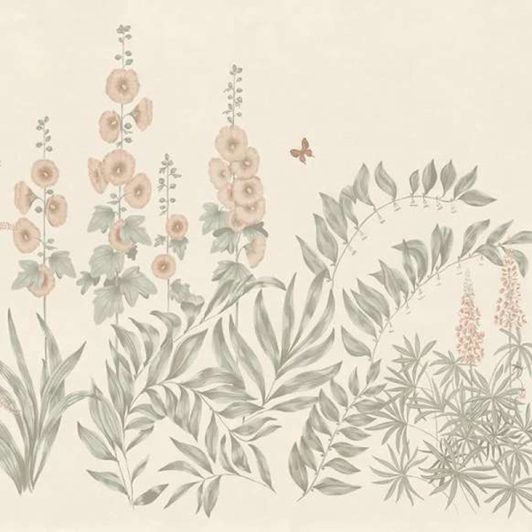 Sandberg präsentiert die Panorama-Tapete Aino, ein üppiges Pflanzendekor, in dem die Stockrose, das blutende Herz und der Pfingstrosenmohn inmitten einer Fülle von Laub blühen. Das handgefertigte botanische Blumenmuster erinnert an die friedlichen Landschaften der Dörfer von Öland, die von Wildblumen gesäumt sind. Zwei Schmetterlinge laden sich diskret in die Szene ein, um dem Ganzen einen Hauch von Leben zu verleihen. Die sanfte Farbpalette verstärkt den Eindruck der Ruhe, die in diesem stillen Garten herrscht.