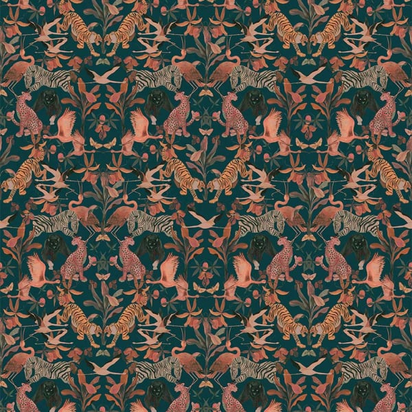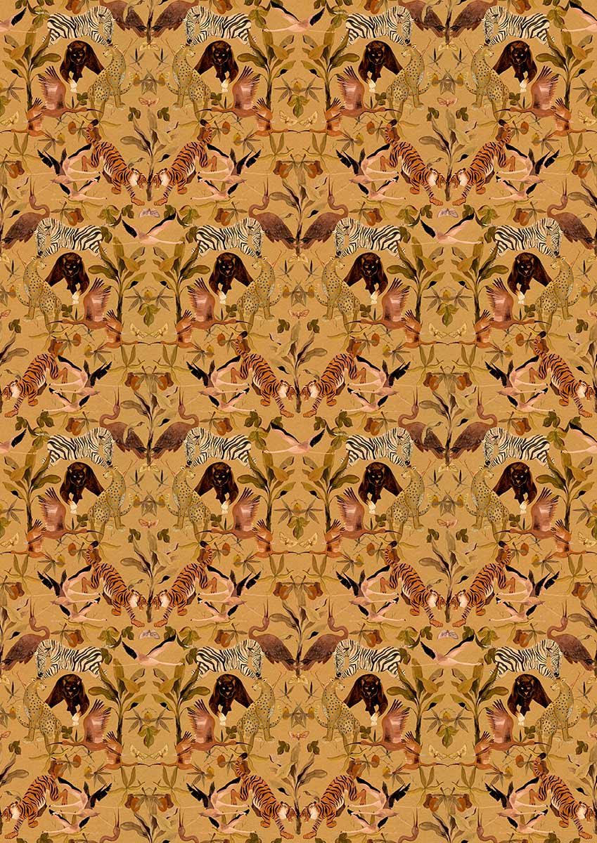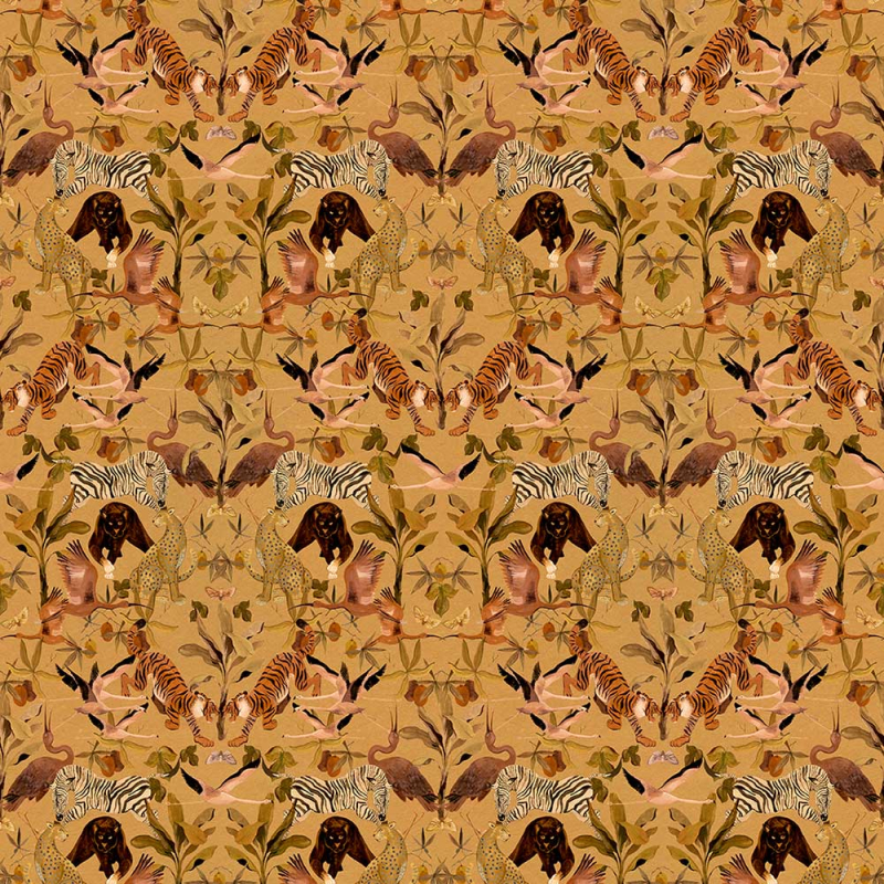Die Panorama-Tapete Échappée Sauvage zeigt ein reiches und üppiges Dschungelmotiv, bevölkert von wilden Tieren, tropischen Vögeln und wellenförmigem Laub. Die Tiere entwickeln sich in einem schwebenden Universum, zwischen Traumwelt und illustriertem Bestiarium. Jedes Detail offenbart die Feinheit der Handzeichnung, von den Katzenkratzern bis zum leuchtenden Gefieder. Diese Kreation wurde umweltfreundlich entworfen und trägt die Signatur von Initiales.