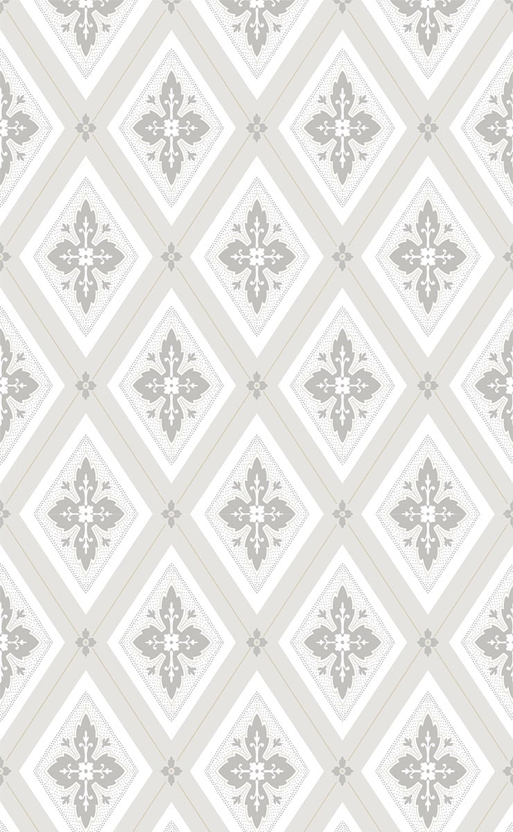 Astrid Flora entfaltet einen eleganten Rhythmus aus Rauten, die stilisierte Pflanzenornamente umschließen. Diese von Düro entworfene Tapete präsentiert ein geometrisches Dekor, das von Damast inspiriert ist, mit weichen Arabesken mit traditionellen Akzenten. Das symmetrische Gitter, das durch feine gestrichelte Linien unterstrichen wird, wird durch blumige Schnittpunkte belebt, die dem Design ein Relief verleihen.