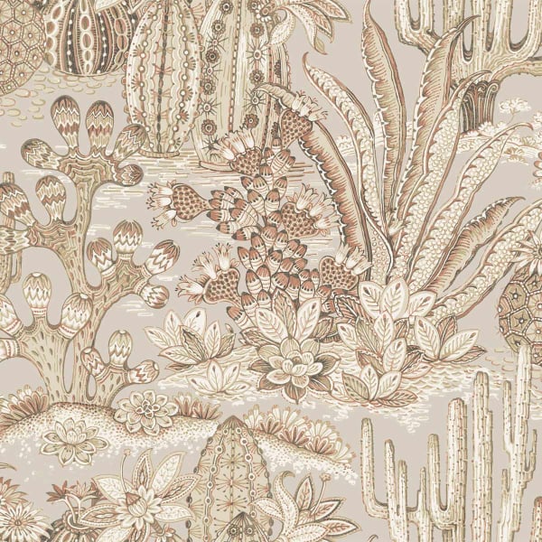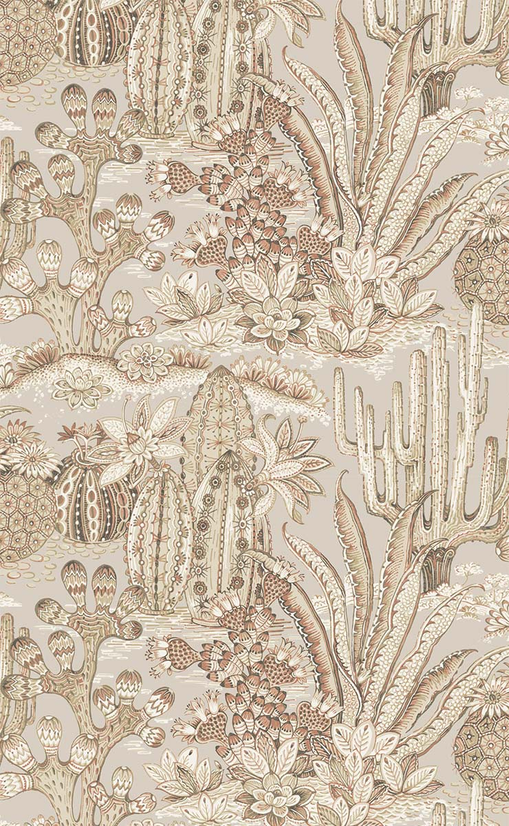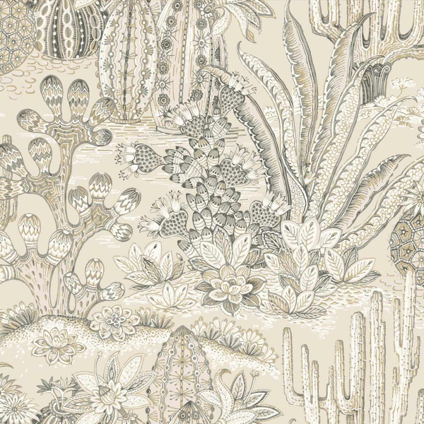 Die Tapete Lotus Land Cacti stellt die atemberaubende Schönheit der trockenen Natur dar. Das botanische Motiv enthüllt eine imaginäre Wüste, die von Kakteen, Aloe und Sukkulenten mit klaren Konturen bevölkert ist. Die dichte und wiederholte Komposition erzeugt einen strukturierten Pflanzenrhythmus, der durch kontrollierte Texturen unterstützt wird. Der von York Wallcoverings aufgebrachte Oberflächendruck fügt ein leichtes Relief hinzu, das die Details unterstreicht.