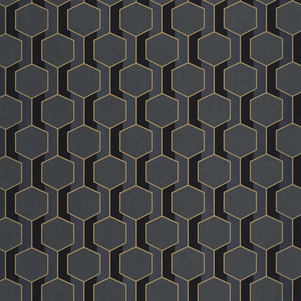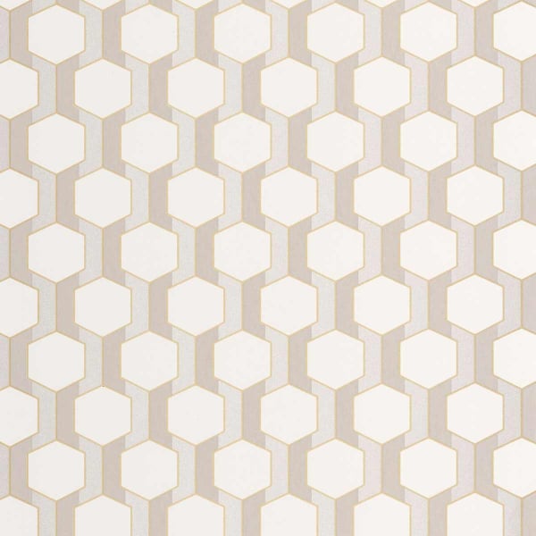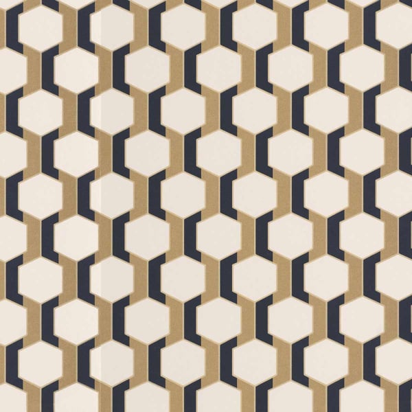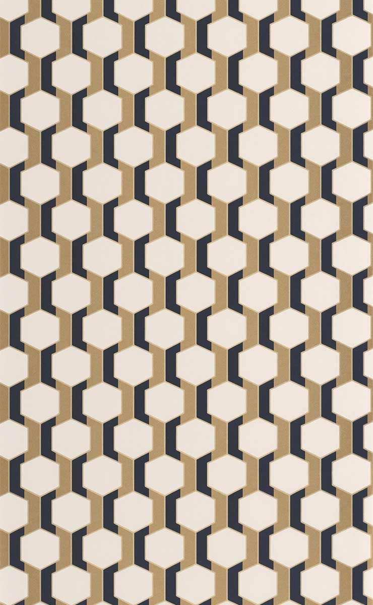 Hamilton ist eine Tapete mit geometrischem Muster, die um regelmäßige Sechsecke herum strukturiert ist, die durch vertikale Linien verbunden sind. Das von den Codes des Art Déco inspirierte Design erinnert an eine Form grafischer Ordnung, die durch eine visuelle Spannung nuanciert wird. Die Präzision der gedruckten Linien unterstreicht das Relief des Dekors. Dieses von Casadeco veröffentlichte Modell spielt mit Volumen und Symmetrie, um einen architektonischen Rhythmus zu schaffen.