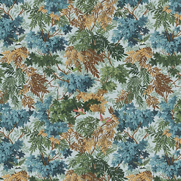 Isidore Leroys Panoramatapete „Vögel“ zeigt üppige Vegetation mit ineinander verschlungenen, breiten Blättern. Die Zweige sind verflochten und erzeugen so einen Eindruck von Tiefe. Kleine Vögel erscheinen zwischen den Zweigen, eingefroren im Moment des Abflugs oder Flügelschlags. Das Design fängt die Vielfalt der Formen und Texturen detailgetreu ein.