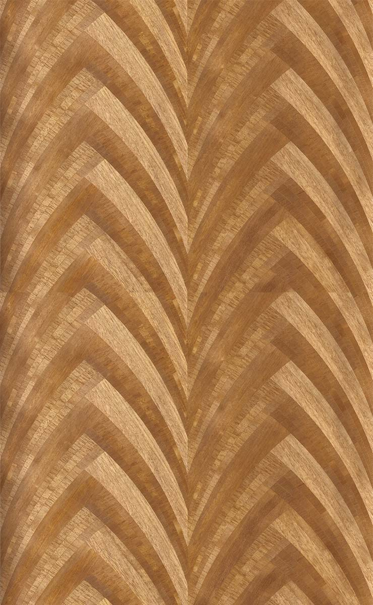 Die Tapete Arches enthüllt ein Spiel aus gebogenen und breiten Linien, die sich regelmäßig miteinander verflechten. Jeder Naturholzstreifen ist fächerförmig angeordnet und zeigt eine feine, ausdrucksstarke Textur. Das Muster offenbart eine subtil unregelmäßige Fischgrätkomposition, die die Tiefe und Struktur des Raumes betont. Nobilis komponiert hier eine rhythmische und lebendige Oberfläche mit ausgeprägtem Relief.