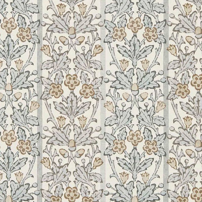 Die Tapete Oak & Blossom präsentiert eine vertikale Komposition von großem Reichtum, typisch für den Arts & Crafts-Stil. Die Eichenblätter umschlingen sich in rhythmischen Arabesken, die von Eicheln und stilisierten Blumen durchsetzt sind, die in ornamentalen Säulen angeordnet sind. Das Muster offenbart ein subtiles Gleichgewicht zwischen geometrischer Strenge und Pflanzenreichtum. Morris and Co unterzeichnet diese Interpretation und würdigt die strukturierte Natur auf lebendige Weise.