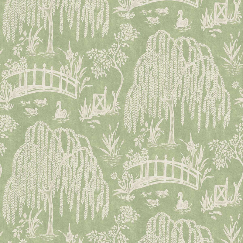 Les Saules entfaltet eine ländliche Landschaft, die von Trauerbäumen, friedlichen Schwänen und gewölbten Brücken bevölkert wird. Das pastorale Motiv stellt die Sanftheit eines Wassergartens dar, der von Stille und fallendem Laub umgeben ist. Diese von Nina Campbell signierte Tapete pflegt die Kunst der Suggestion in einem Design mit akribischen Details.