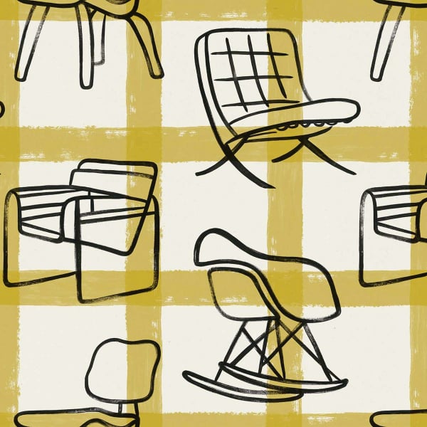 Emblematische Stühle im modernen Stil entfalten sich auf der Tapete Iconicos. Das leicht gezeichnete, figurative Muster mit klaren Konturen erstreckt sich auf einem unregelmäßig karierten Hintergrund. Einfache und dynamische Linien bilden die klassischen Sessel. Coordonnée feiert das Design in Bewegung, in einer nüchternen und ausdrucksstarken Sprache.
