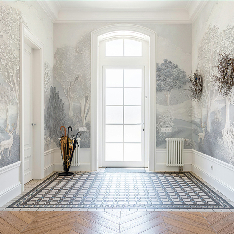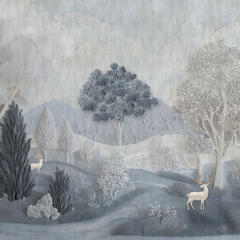 Ein skulpturales Waldmotiv ziert die Panoramatapete Alcova Special von Code. In stiller Andacht erstreckt sich eine Waldlandschaft bis zum Horizont, zwischen dichtem Laub und fein geformten Ästen. Regungslose, im Licht stehende Rehe schaffen eine Szene zwischen Realität und Traum. Diese Tapete, gedruckt auf einem strukturierten Trägermaterial, das an Naturfasern erinnert, fängt einen bezaubernden Horizont perfekt ein.