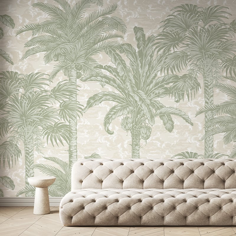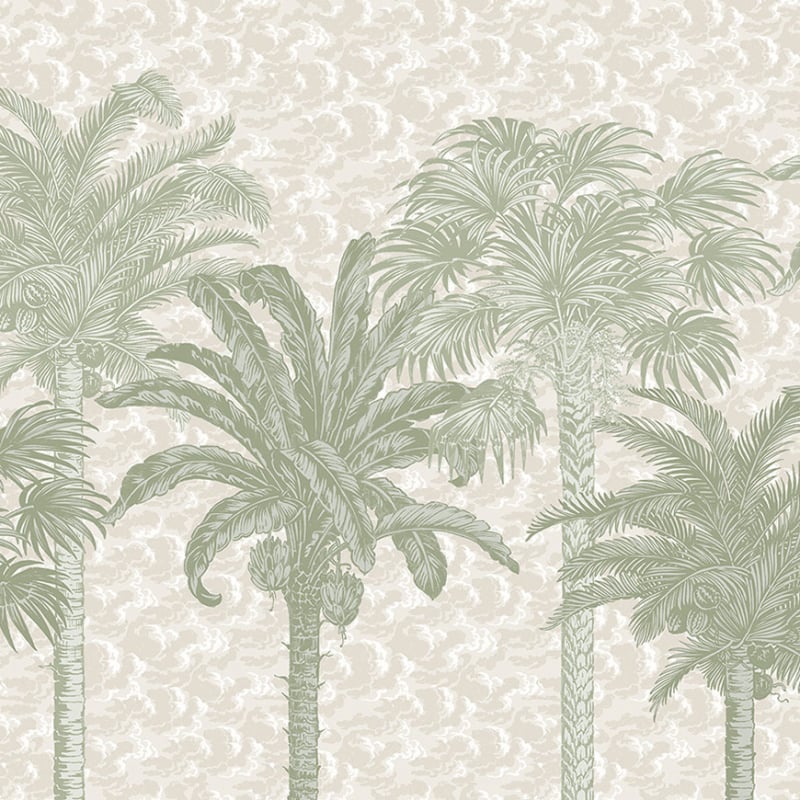 Die Panoramatapete Oasi präsentiert ein tropisches botanisches Motiv, bevölkert von Palmen und Bananenbäumen. Die stilisierten Bäume zeichnen sich durch strukturierte Stämme, gerippte Blätter und gemeißelte Fruchtstände aus. Im Hintergrund schafft ein bewölkter Himmel einen poetischen und imaginären Hauch. Diese von Code signierte Tapete erinnert an eine exotische und zeitlose Szene.
