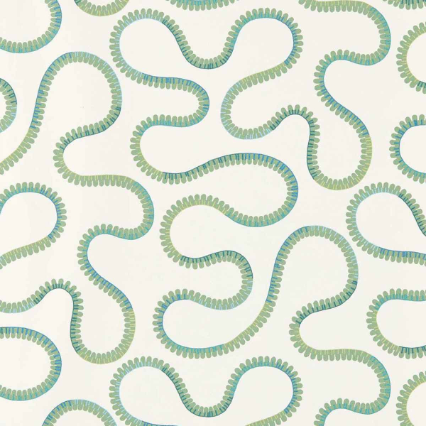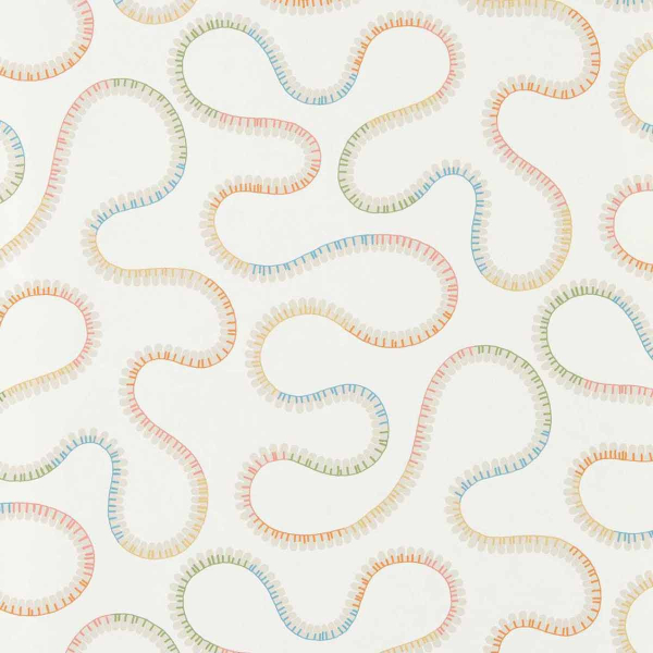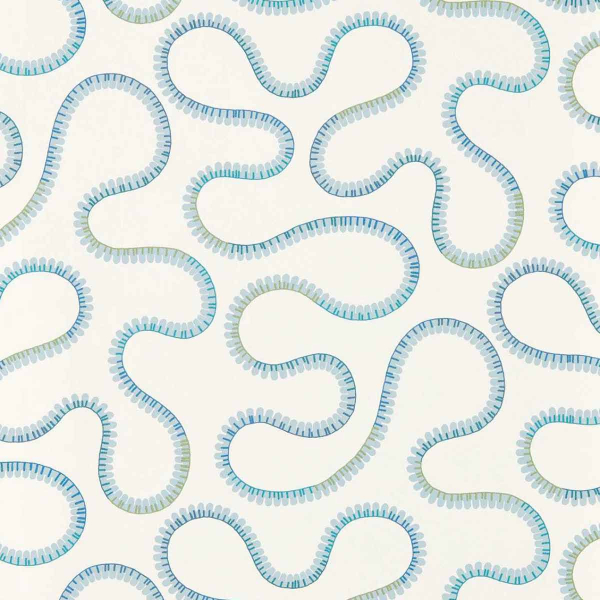 Die Tapete Bimble entfaltet geschmeidige Linien mit regelmäßigen Wellen. Eine Reihe kleiner, abgerundeter Formen, die an gestickte Punkte erinnern, unterstreicht den Rhythmus. Jede Linie offenbart einen subtilen Farbverlauf, der Tiefe und einen Eindruck natürlicher Bewegung vermittelt. Dieses sinusförmige Muster, das von Scion entworfen wurde, basiert auf einem Wechsel von Kurven, die das Dekor strukturieren.